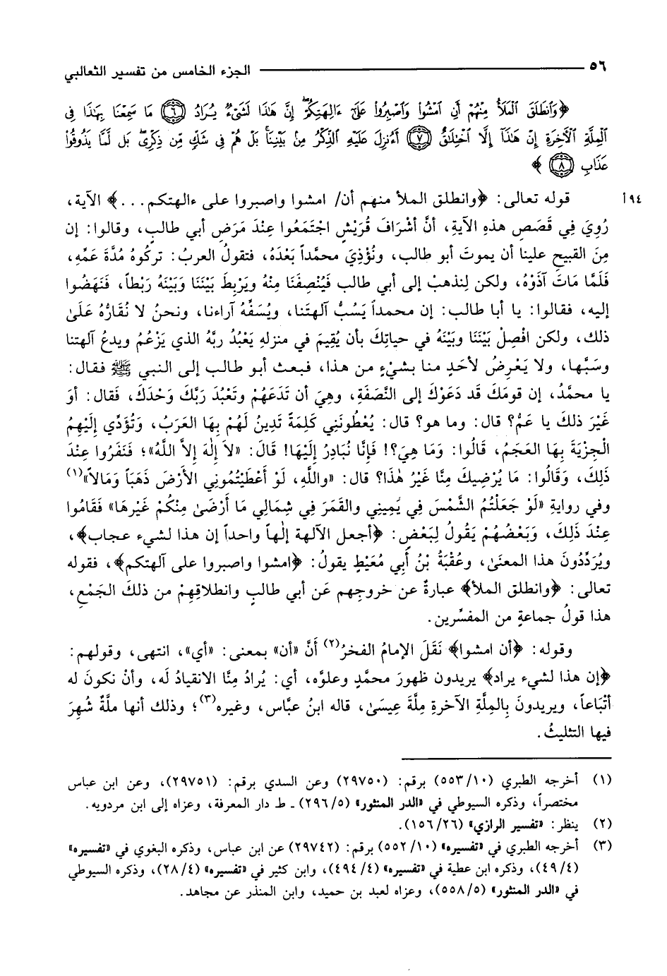 يا محمَّدُ، إن قومَكَ قَد دَعَوْكَ إلى النَّصَفَةِ، وهِيَ أن تَدَعَهُمْ وتَعْبُدَ رَبَّكَ وَحْدَكَ، فَقال: أوَ غَيْرَ ذلكَ يا عَمُّ؟ قال: وما هو؟ قال: يُعْطُونَنِي كَلِمَةً تَدِينُ لَهُمْ بِهَا العَرَبُ، وَتُؤَدِّي إلَيْهِمُ الْجِزْيَةَ بِهَا العَجَمُ، قَالُوا: وَمَا هِيَ؟! فَإنَّا نُبَادِرُ إلَيْهَا! قَالَ: «لاَ إله إلاَّ اللَّهُ» فَنَفَرُوا عِنْدَ ذَلِكَ، وَقَالُوا: مَا يُرْضِيكَ مِنَّا غَيْرُ هذا؟ قال: «واللَّهِ، لَوْ أَعْطَيْتُمُونِي الأَرْضَ ذَهَبَاً وَمَالاً» «1» وفي روايةِ «لَوْ جَعَلْتُمُ الشَّمْسَ فِي يَمِينِي والقَمَرَ فِي شِمَالِي مَا أرضى مِنْكُمْ غَيْرُهَا» فَقَامُوا عِنْدَ ذَلِكَ، وَبَعْضُهُمْ يَقُولُ لِبَعْضٍ: أَجَعَلَ الْآلِهَةَ إِلهاً واحِداً إِنَّ هذا لَشَيْءٌ عُجابٌ، ويُرَدِّدُونَ هذا المعنى، وعُقْبَةُ بْنُ أَبِي مُعَيْطٍ يقول: امْشُوا وَاصْبِرُوا عَلى آلِهَتِكُمْ، فقوله تعالى: وَانْطَلَقَ الْمَلَأُ عبارةٌ عن خروجِهم عَن أبي طالبٍ وانطلاقِهِمْ من ذلكَ الجَمْعِ، هذا قولُ جماعةٍ من المفسرين.