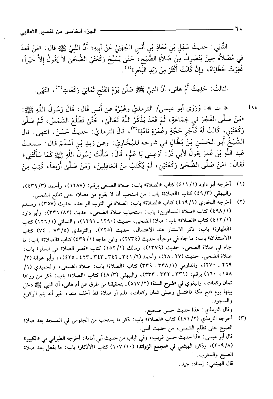 (3) أخرجه الترمذي (2/ 481) كتاب «الصلاة» باب: ذكر ما يستحب من الجلوس في المسجد بعد صلاة الصبح حتى تطلع الشمس، من حديث أنس.