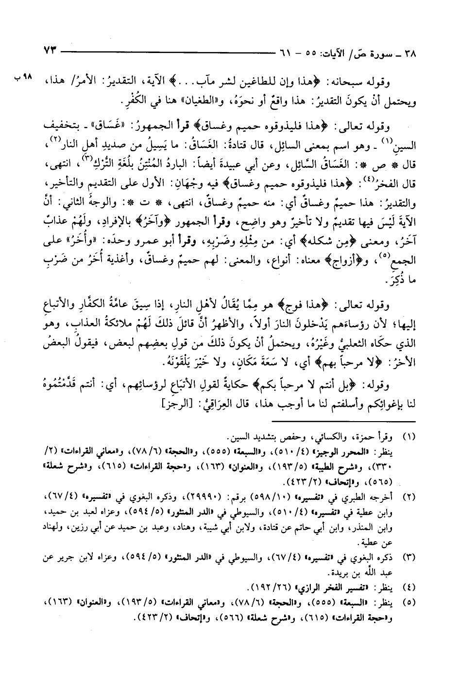 وقوله تعالى: هذا فَلْيَذُوقُوهُ حَمِيمٌ وَغَسَّاقٌ قرأ الجمهورُ: «غَسَاق» - بتخفيف السينِ «1» - وهو اسم بمعنى السائِل، قال قتادةُ: الغَسَاقُ: ما يَسِيلُ من صديدِ أهلِ النار «2» ، قال- ص-: الغَسَاقُ السَّائِل، وعن أبي عبيدةَ أيضاً: الباردُ المُنْتِنُ بلُغَةِ التُّرْكِ «3» ، انتهى، قال الفخرُ «4» : هذا فَلْيَذُوقُوهُ حَمِيمٌ وَغَسَّاقٌ فيه وجْهَانِ: الأول على التقديمِ والتأخير، والتقديرُ: هذا حميمٌ وغساقٌ أي: منه حميمٌ وغساقٌ، انتهى، ت: والوجهُ الثاني: أنَّ الآيةَ لَيْسَ فيها تقديمٌ ولا تأخير وهو واضح، وقرأ الجمهور وَآخَرُ بالإفرادِ، ولَهُمْ عذابٌ آخَرُ، ومعنى مِنْ شَكْلِهِ أي: من مِثْلِهِ وضَرْبِهِ، وقرأ أبو عمرو وحده: «وأخر» على الجمع «5» ، وأَزْواجٌ معناه: أنواع، والمعنى: لهم حميمٌ وغساقٌ، وأغذية أُخَرُ من ضَرْبِ ما ذُكِرَ.