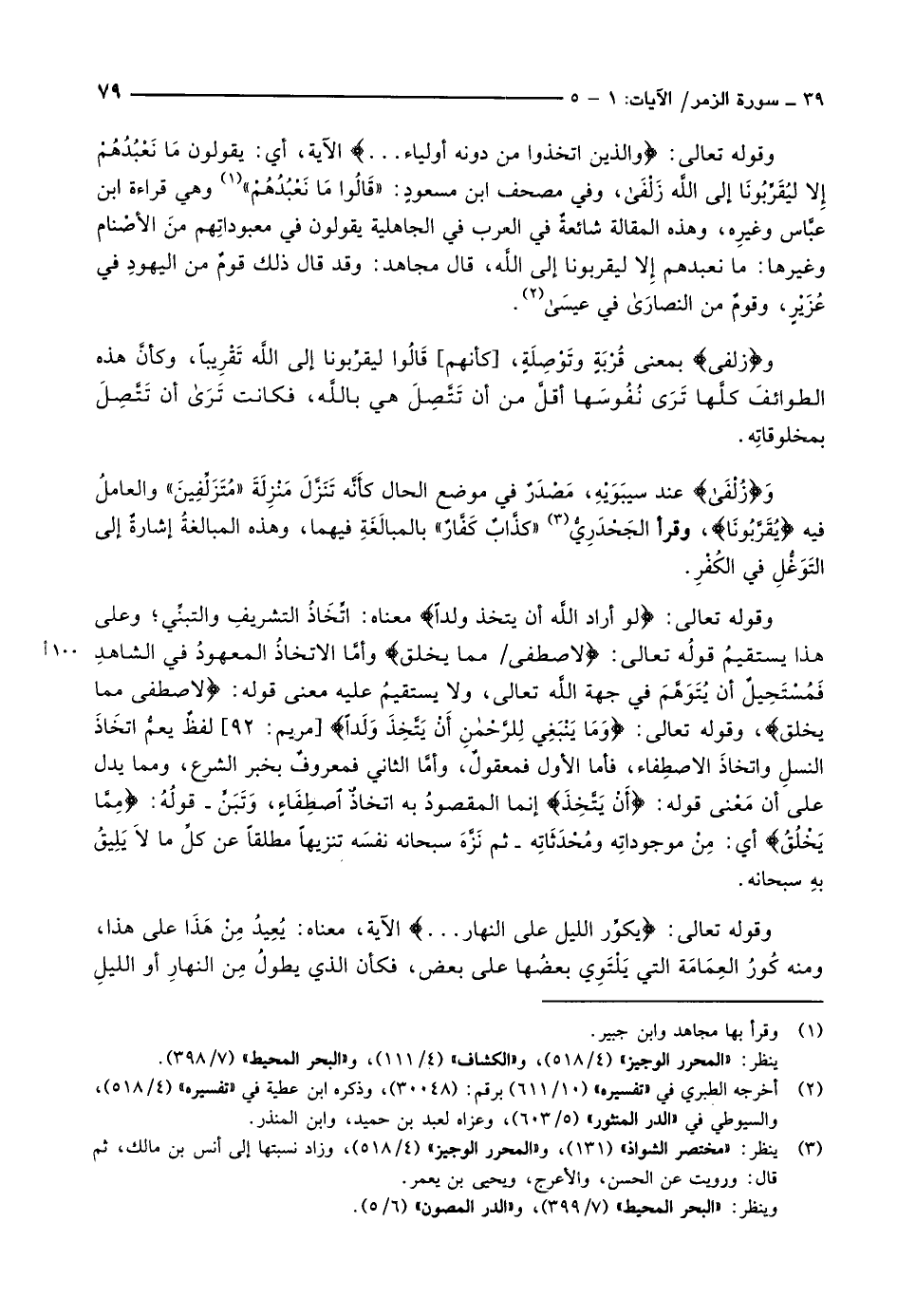 وزُلْفى عند سيبَوَيْهِ، مَصْدَرٌ في موضع الحال كأَنَّه تَنَزَّلَ مَنْزِلَةَ «مُتَزَلِّفِينَ» والعاملُ فيه لِيُقَرِّبُونا، وقرأ الجَحْدَرِيُّ «3» «كذَّابٌ كَفَّارٌ» بالمبالَغَةِ فيهما، وهذه المبالغةُ إشارةٌ إلى التَوَغُّلِ في الكُفْرِ.