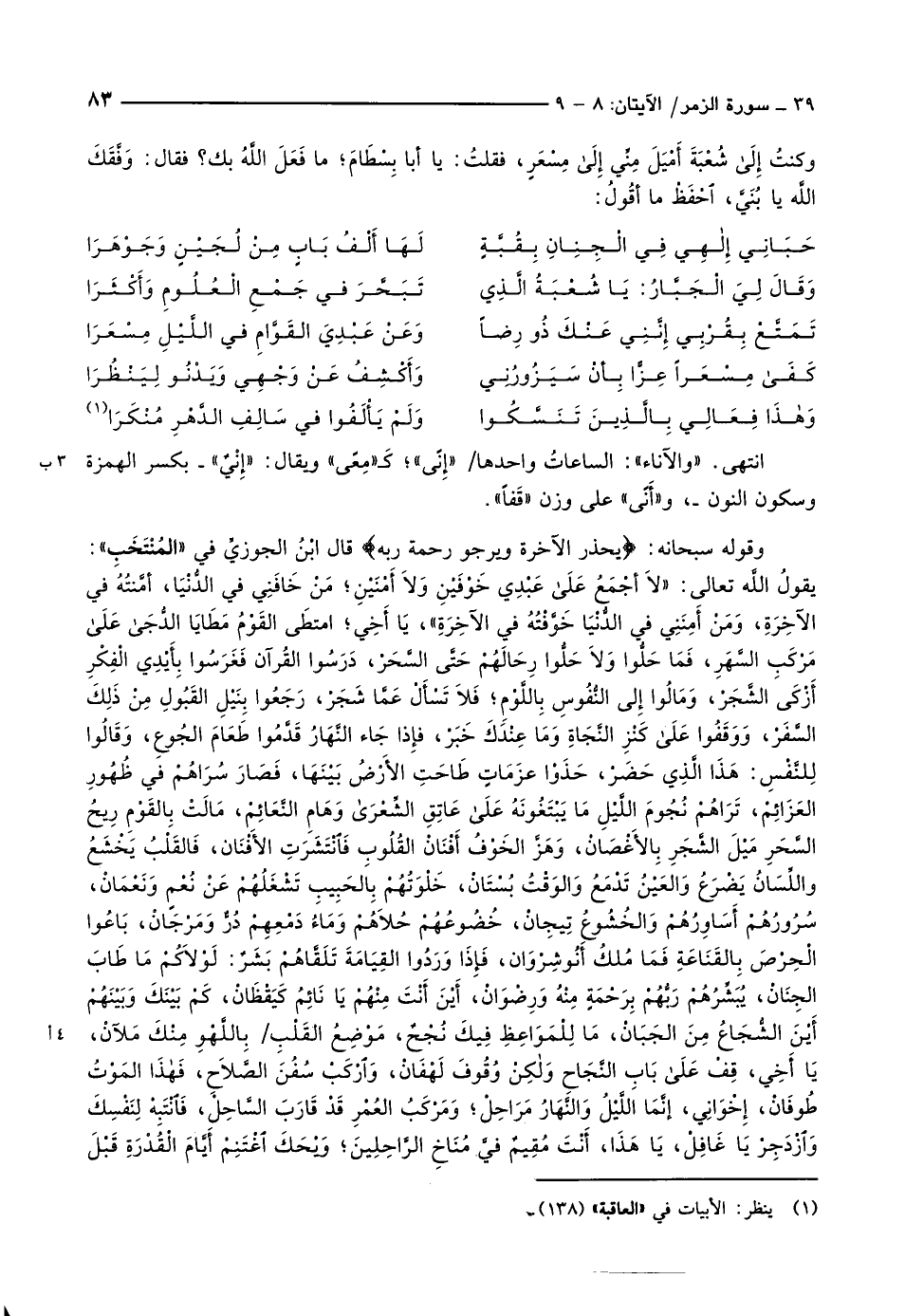 يقولُ اللَّه تعالى: «لاَ أجْمَعُ على عَبْدِي خَوْفَيْنِ وَلاَ أَمْنَيْنِ مَنْ خَافَنِي فِي الدُّنْيَا، أَمَّنْتُهُ فِي الآخِرَةِ، وَمَنْ أَمِنَنِي في الدُّنْيَا خَوَّفْتُهُ في الآخِرَةِ» ، يَا أَخِي امتطَى القَوْمُ مَطَايَا الدجى على مَرْكَبِ السَّهَرِ، فَمَا حَلُّوا وَلاَ حَلُّوا رِحَالَهُمْ حَتَّى السَّحَرْ، دَرَسُوا القُرآن فَغَرَسُوا بِأَيْدِي الْفِكْرِ أَزْكَى الشَّجَرْ، وَمَالُوا إلى النُّفُوسِ بِاللَّوْمِ فَلاَ تَسْأَلْ عَمَّا شَجَرْ، رَجَعُوا بِنَيْلِ القَبُولِ مِنْ ذَلِكَ السَّفَرْ، وَوَقَفُوا على كَنْزِ النَّجَاةِ وَمَا عِنْدَكَ خَبَرْ، فإذا جَاء النَّهَارُ قَدَّمُوا طَعَامَ الجُوعِ، وَقَالُوا لِلنَّفْسِ: هَذَا الَّذِي حَضَرْ، حَذَوْا عزَمَاتٍ طَاحَتِ الأَرْضُ بَيْنَهَا، فَصَارَ سُرَاهُمْ في ظُهُورِ العَزَائِمْ، تَرَاهُمْ نُجُومَ اللَّيْلِ مَا يَبْتَغُونَهُ على عَاتِقِ الشعرى وَهَامِ النَّعَائِمْ، مَالَتْ بِالقَوْمِ رِيحُ السَّحَرِ مَيْلَ الشَّجَرِ بِالأَغْصَانْ، وَهَزَّ الخَوْفُ أَفْنَانْ القُلُوبِ فانتشرت الأَفْنَان، فَالقَلْبُ يَخْشَعُ واللِّسَانُ يَضْرَعُ وَالعَيْنُ تَدْمَعُ وَالوَقْتُ بُسْتَانْ، خَلَوْتُهُمْ بِالحَبِيبِ تَشْغَلُهُمْ عَنْ نُعْمٍ وَنَعْمَانْ، سُرُورُهُمْ أَسَاوِرُهُمْ وَالخُشُوعُ تِيجِانْ، خُضُوعُهُمْ حُلاَهُمْ وَمَاءُ دَمْعِهِمْ دُرٌّ وَمَرْجَانْ، بَاعُوا الْحِرْصَ بِالقَنَاعَةِ فَمَا مُلكُ أَنُوشِرْوَان، فَإذَا وَرَدُوا القِيَامَةَ تَلَقَّاهُمْ بَشَرٌ: لَوْلاَكُمْ مَا طَابَ الجِنَانْ، يُبَشِّرُهُمْ رَبُّهُمْ بِرَحْمَةٍ مِنْهُ وَرِضْوَانْ، أَيْنَ أَنْتَ مِنْهُمْ يَا نَائِمُ كَيَقْظَانْ، كَمْ بَيْنَكَ وَبَيْنَهُمْ أَيْنَ الشُّجَاعُ مِنَ الجَبَانْ، مَا لِلْمَوَاعِظِ فِيكَ نُجْحٌ، مَوْضِعُ القَلْبِ/ بِاللَّهْوِ مِنْكَ مَلآنْ، يَا أَخِي، قِفْ على بَابِ النَّجَاحِ ولكن وُقُوفَ لُهْفَانْ، واركب سُفُنَ الصَّلاَحِ، فهذا المَوْتُ طُوفَانْ، إخْوَانِي، إنَّمَا اللَّيْلُ وَالنَّهَارُ مَرَاحِلْ وَمَرْكَبُ العُمْرِ قَدْ قَارَبَ السَّاحِلْ، فانتبه لِنَفْسِكَ وازدجر يَا غَافِلْ، يَا هَذَا، أَنْتَ مُقِيمٌ فيَّ مُنَاخِ الرَّاحِلِينَ ويحك اغتنم أيّام القدرة قبل