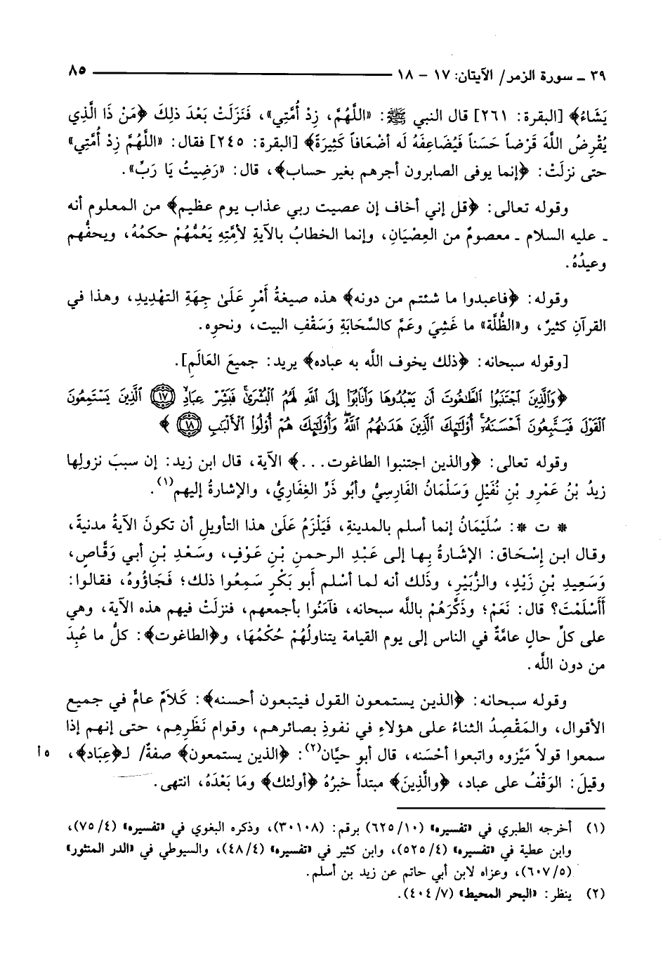 وقوله تعالى: وَالَّذِينَ اجْتَنَبُوا الطَّاغُوتَ ... الآية، قال ابن زيد: إن سببَ نزولِها زيدُ بْنُ عَمْرِو بْنِ نُفَيْلٍ وَسَلْمَانُ الفَارِسِيُّ وأبُو ذَرٍّ الغِفَارِيُّ، والإشارةُ إليهم «1» .
