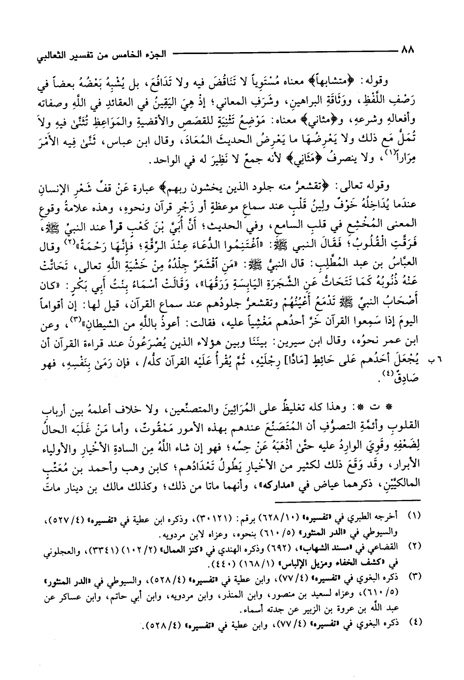 وقوله: مُتَشابِهاً معناه مُسْتَوِياً لا تَنَاقُضَ فيه ولا تَدَافُعَ، بل يُشْبِهُ بَعْضُهُ بعضاً في رَصْفِ اللَّفْظِ، ووَثَاقَةِ البراهينِ، وشَرَفِ المعاني إذْ هِيَ اليَقِينُ في العقائدِ في اللَّهِ وصفاته وأفعاله وشرعه، ومَثانِيَ معناه: مَوْضِعُ تَثْنِيَةٍ للقصَصِ والأقضيةِ والمَوَاعِظِ تثنى فيهِ ولاَ تُمَلُّ مَع ذلك ولا يَعْرِضُهَا ما يَعْرِضُ الحديثَ المَعَادَ، وقال ابن عباس، ثنى فِيه الأَمْرَ مِرَاراً «1» ، ولا ينصرفُ مَثانِيَ لأنه جمعٌ لا نَظِيرَ له في الواحد.