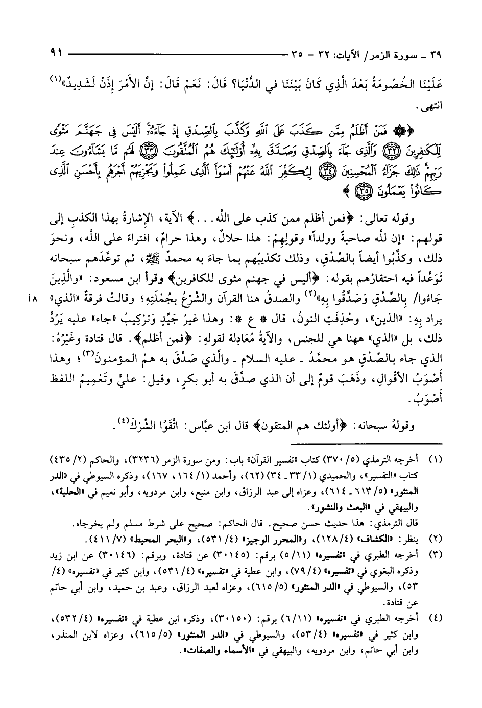 فَمَنْ أَظْلَمُ مِمَّنْ كَذَبَ عَلَى اللَّهِ وَكَذَّبَ بِالصِّدْقِ إِذْ جاءَهُ أَلَيْسَ فِي جَهَنَّمَ مَثْوىً لِلْكافِرِينَ (32) وَالَّذِي جاءَ بِالصِّدْقِ وَصَدَّقَ بِهِ أُولئِكَ هُمُ الْمُتَّقُونَ (33) لَهُمْ ما يَشاؤُنَ عِنْدَ رَبِّهِمْ ذلِكَ جَزاءُ الْمُحْسِنِينَ (34) لِيُكَفِّرَ اللَّهُ عَنْهُمْ أَسْوَأَ الَّذِي عَمِلُوا وَيَجْزِيَهُمْ أَجْرَهُمْ بِأَحْسَنِ الَّذِي كانُوا يَعْمَلُونَ (35)