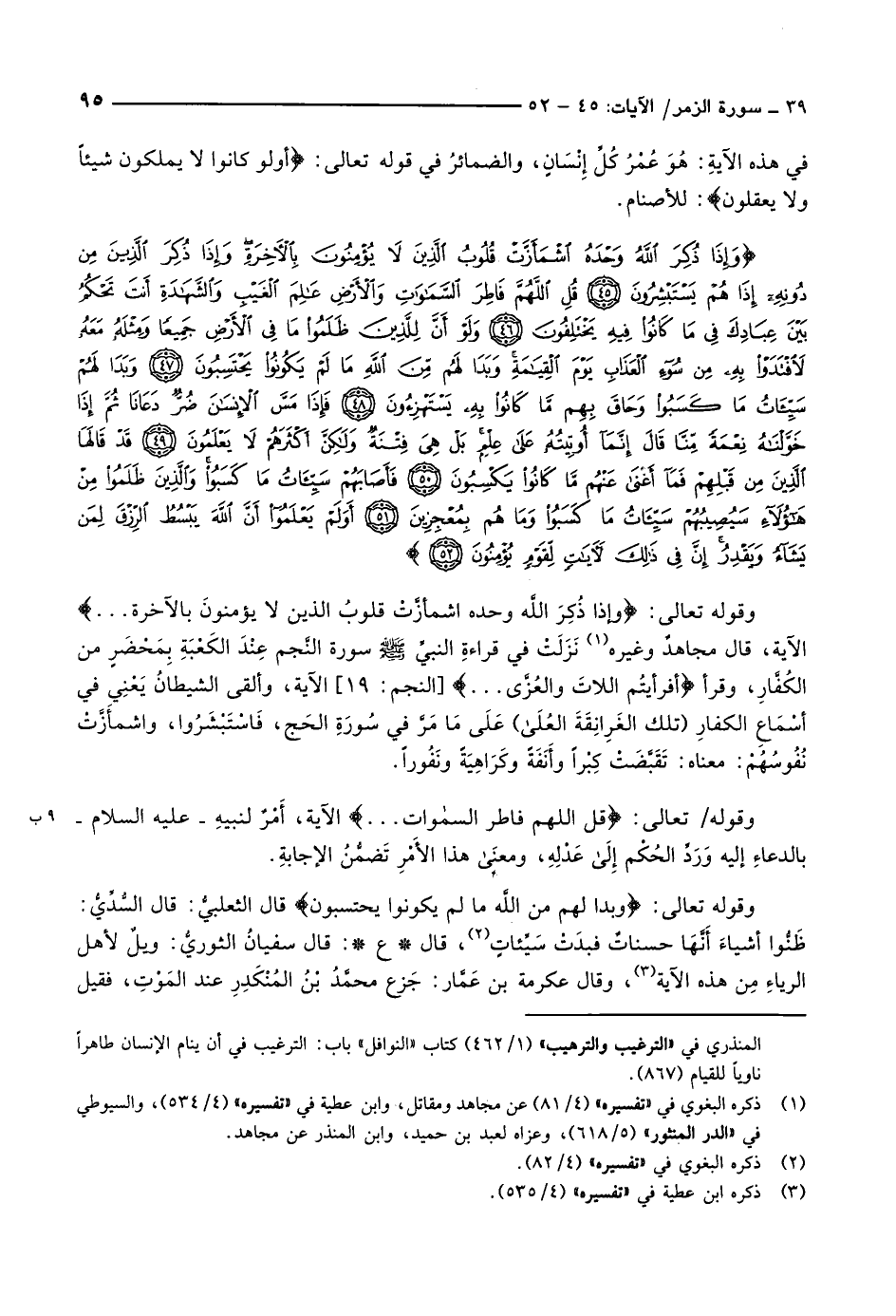 وَإِذا ذُكِرَ اللَّهُ وَحْدَهُ اشْمَأَزَّتْ قُلُوبُ الَّذِينَ لا يُؤْمِنُونَ بِالْآخِرَةِ وَإِذا ذُكِرَ الَّذِينَ مِنْ دُونِهِ إِذا هُمْ يَسْتَبْشِرُونَ (45) قُلِ اللَّهُمَّ فاطِرَ السَّماواتِ وَالْأَرْضِ عالِمَ الْغَيْبِ وَالشَّهادَةِ أَنْتَ تَحْكُمُ بَيْنَ عِبادِكَ فِي ما كانُوا فِيهِ يَخْتَلِفُونَ (46) وَلَوْ أَنَّ لِلَّذِينَ ظَلَمُوا ما فِي الْأَرْضِ جَمِيعاً وَمِثْلَهُ مَعَهُ لافْتَدَوْا بِهِ مِنْ سُوءِ الْعَذابِ يَوْمَ الْقِيامَةِ وَبَدا لَهُمْ مِنَ اللَّهِ مَا لَمْ يَكُونُوا يَحْتَسِبُونَ (47) وَبَدا لَهُمْ سَيِّئاتُ ما كَسَبُوا وَحاقَ بِهِمْ ما كانُوا بِهِ يَسْتَهْزِؤُنَ (48) فَإِذا مَسَّ الْإِنْسانَ ضُرٌّ دَعانا ثُمَّ إِذا خَوَّلْناهُ نِعْمَةً مِنَّا قالَ إِنَّما أُوتِيتُهُ عَلى عِلْمٍ بَلْ هِيَ فِتْنَةٌ وَلكِنَّ أَكْثَرَهُمْ لا يَعْلَمُونَ (49)