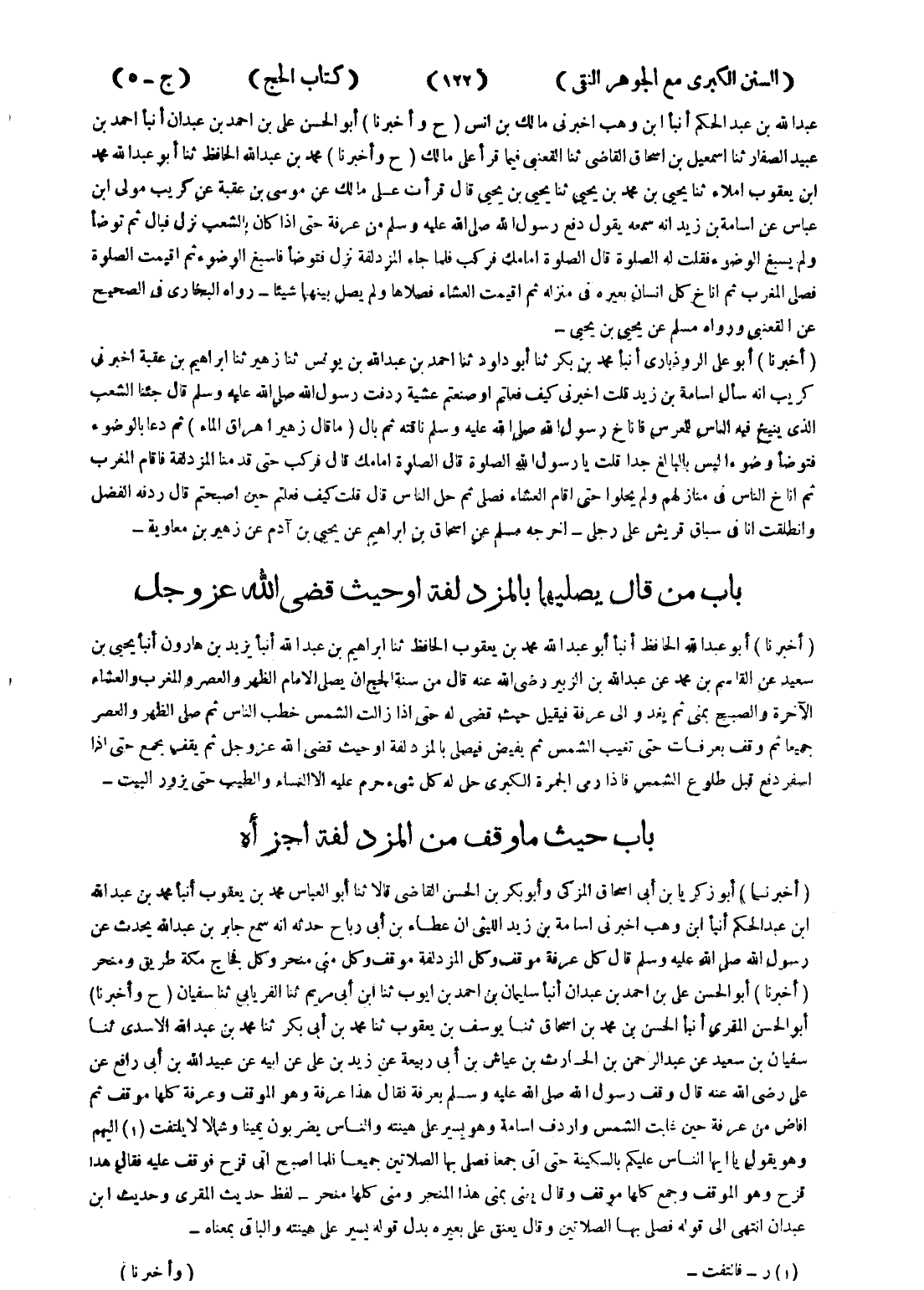 - (أخبرنا) أبو على الروذبارى أنبأ محمد بن بكر ثنا أبو داود ثنا احمد بن عبد الله بن يونس ثنا زهير ثنا ابراهيم بن عقبة اخبرني كريب انه سأل اسامة بن زيد قلت اخبرني كيف فعلتم أو صنعتم عشية ردفت رسول الله صلى الله عليه وسلم قال جئنا الشعب الذى ينيخ فيه الناس للمعرس فاناخ رسول الله صلى الله عليه وسلم ناقته ثم بال (ما قال زهيرا هراق الماء) ثم دعا بالوضوء فتوضأ وضوءا ليس بالبالغ جدا قلت يا رسول الله الصلوة قال الصلوة امامك قال فركب حتى قدمنا المزدلفة فاقام المغرب ثم اناخ الناس في منازلهم ولم يحلوا حتى اقام العشاء فصلى ثم حل الناس قال قلت كيف فعلتم حين اصبحتم قال ردفه الفضل و انطلقت انا في سباق قريش على رجلى - اخرجه مسلم عن اسحاق بن ابراهيم عن يحيى بن آدم عن زهير بن معاوية