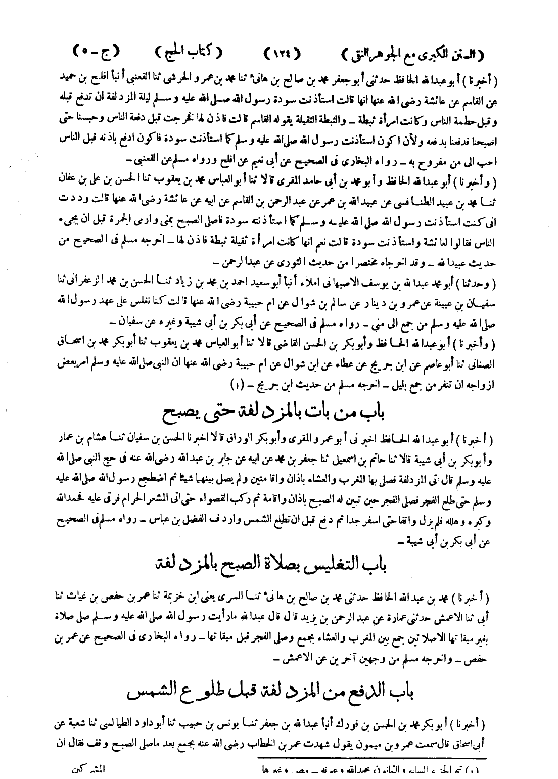 - (وأخبرنا) أبو عبد الله الحافظ وأبو بكر بن الحسن القاضى قالا ثنا أبو العباس محمد بن يعقوب ثنا أبو بكر محمد بن اسحاق الصغانى ثنا أبو عاصم عن ابن جريج عن عطاء عن ابن شوال عن ام حبيبة رضى الله عنها ان النبي صلى الله عليه وسلم امر بعض ازواجه ان تنفر من جمع بليل - اخرجه مسلم من حديث ابن جريج - (1) باب من بات المزدلفة حتى يصبح
