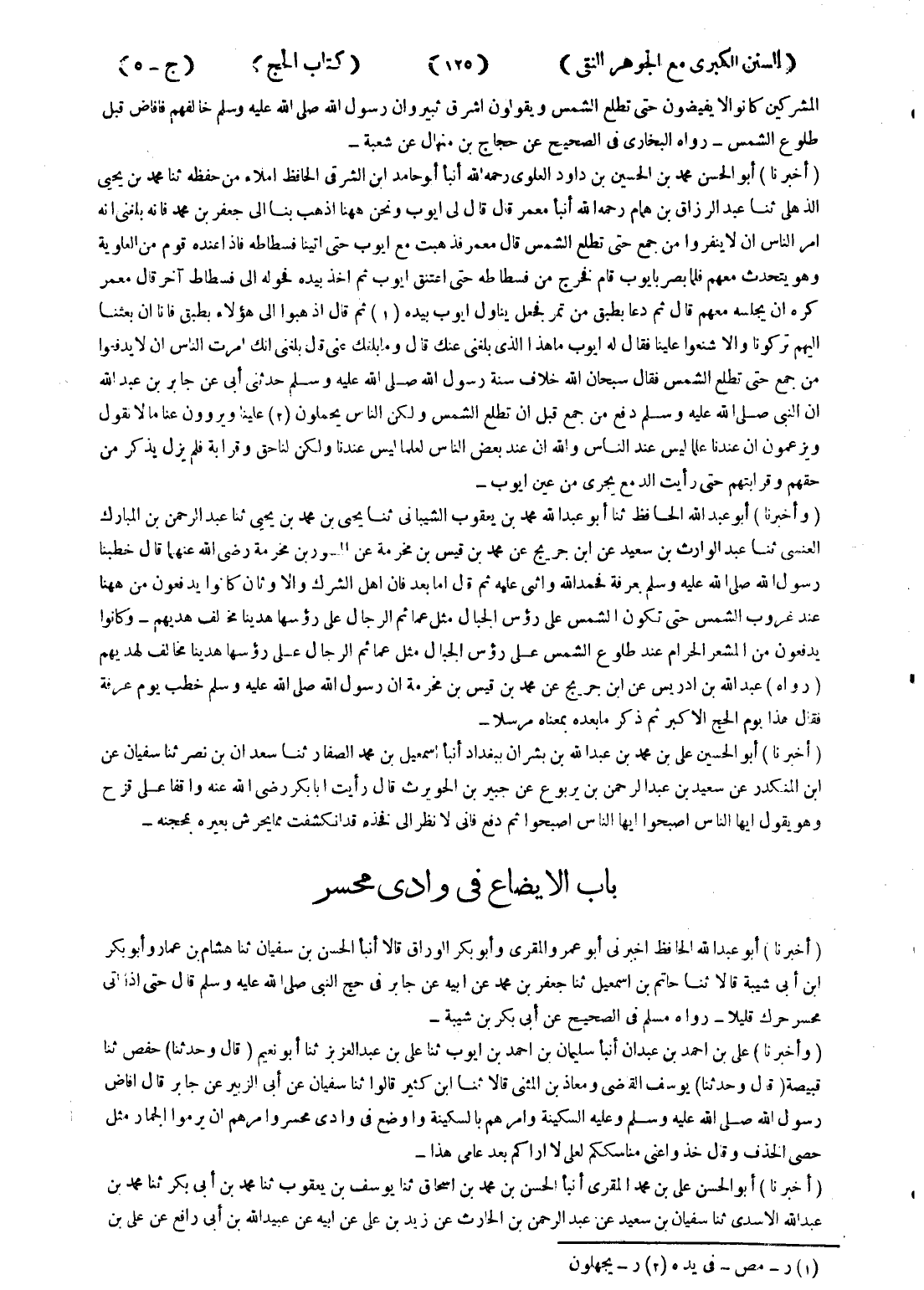 (أخبرنا) أبو عبد الله الحافظ اخبرني أبو عمرو المقرى وأبو بكر الوراق قالا أنبأ الحسن بن سفيان ثنا هشام بن عمار وأبو بكر ابن أبى شيبة قالا ثنا حاتم بن اسمعيل ثنا جعفر بن محمد عن ابيه عن جابر في حج النبي صلى الله عليه وسلم قال حتى إذا اتى محسر حرك قليلا - رواه مسلم في الصحيح عن أبى بكر بن أبى شيبة (وأخبرنا) على بن احمد بن عبدان أنبأ سليمان بن احمد بن ايوب ثنا على بن عبد العزيز ثنا أبو نعيم (قال وحدثنا) حفص ثنا قبيصة (قال وحدثنا) يوسف القاضى ومعاذ بن المثنى قالا ثنا ابن كثير قالوا ثنا سفيان عن أبى الزبير عن جابر قال افاض رسول الله صلى الله عليه وسلم السكينة وامرهم بالسكينة واوضع في وادى محسر وامرهم ان يرموا الجمار مثل حصى الخذف وقال خذوا عنى مناسككم لعلى لا اراكم بعد عامى هذا
