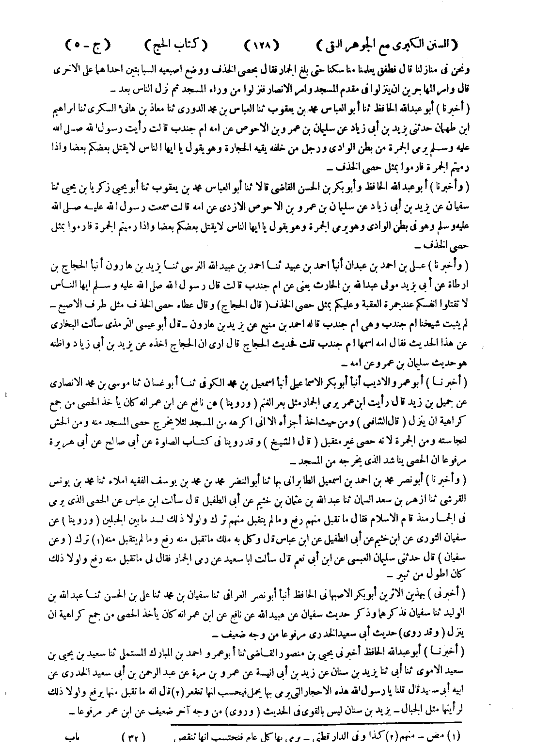 - (أخبرنا) بهذين الاثرين أبو بكر الاصبهاني الحافظ أنبأ أبو نصر العراقى ثنا سفيان بن محمد ثنا على بن الحسن ثنا عبد الله بن الوليد ثنا سفيان فذكرهما وذكر حديث سفيان عن عبيدالله عن نافع عن ابن عمر انه كان يأخذ الحصى من جمع كراهية ان ينزل (وقد روى) حديث أبى سعيد الخدرى مرفوعا من وجه ضعيف