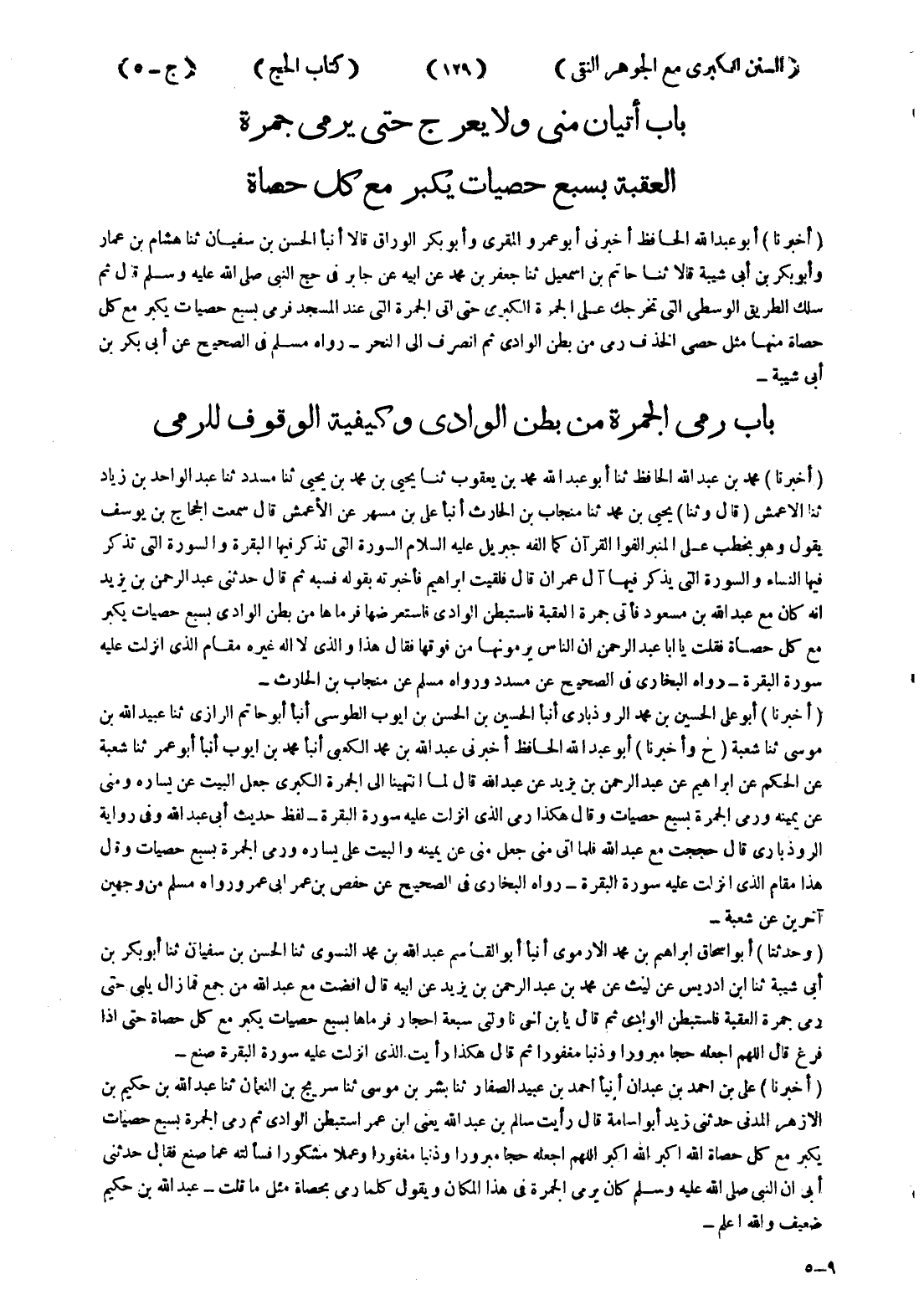 (أخبرنا) أبو عبد الله الحافظ أخبرني أبو عمرو المقرى وأبو بكر الوراق قالا أنبأ الحسن بن سفيان ثنا هشام بن عمار وأبو بكر بن أبى شيبة قالا ثنا حاتم بن اسمعيل ثنا جعفر بن محمد عن ابيه عن جابر في حج النبي صلى الله عليه وسلم قال ثم سلك الطريق الوسطى التى تخرجك على الجمرة الكبرى حتى اتى الجمرة التى عند المسجد فرمى بسبع حصيات يكبر مع كل حصاة منها مثل حصى الخذف رمى من بطن الوادي ثم انصرف إلى النحر - رواه مسلم في الصحيح عن أبى بكر بن أبى شيبة - باب رمى الجمرة من بطن الوادي وكيفية الوقوف للرمي