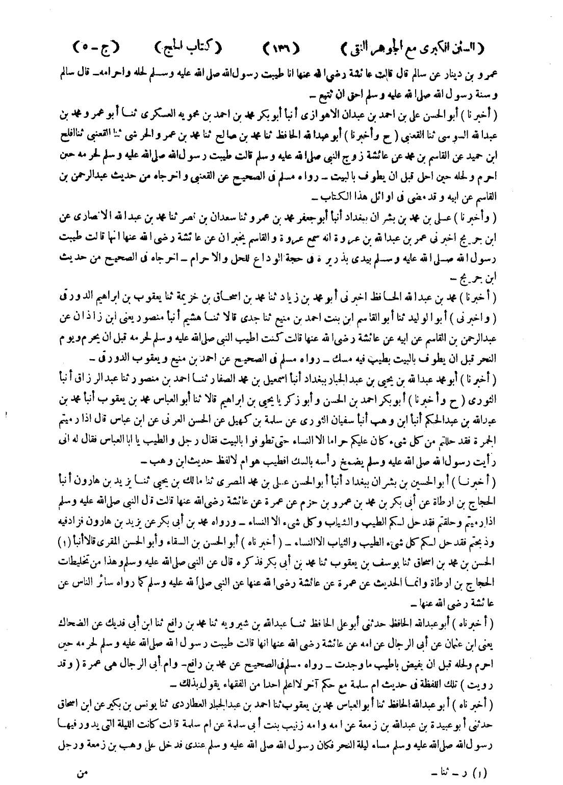 - (أخبرنا) أبو عبد الله الحافظ حدثنى أبو على الحافظ ثنا عبد الله بن شيرويه ثنا محمد بن رافع ثنا ابن أبى فديك عن الضحاك يعنى ابن عثمان عن أبى الرجال عن امه عن عائشة رضى الله عنها انها قالت طيبت رسول الله صلى الله عليه وسلم لحرمه حين احرم ولحله قبل ان يفيض باطيب ما وجدت - رواه مسلم في الصحيح عن محمد بن رافع - وام أبى الرجال هي عمرة (وقد رويت) تلك اللفظة في حديث ام سلمة مع حكم آخر لااعلم احدا من الفقهاء يقول بذلك - (أخبرناه) أبو عبد الله الحافظ ثنا أبو العباس محمد بن يعقوب ثنا احمد بن عبد الجبار العطاردي ثنا يونس بن بكير عن ابن اسحاق حدثنى أبو عبيدة بن عبد الله بن زمعة عن امه وامه زنيب بنت أبى سلمة عن ام سلمة قالت كانت اليلة التى يدور فيها رسول الله صلى الله عليه وسلم مساء ليلة النحر فكان رسول الله صلى الله عليه وسلم عندي فدخل على وهب بن زمعة ورجل