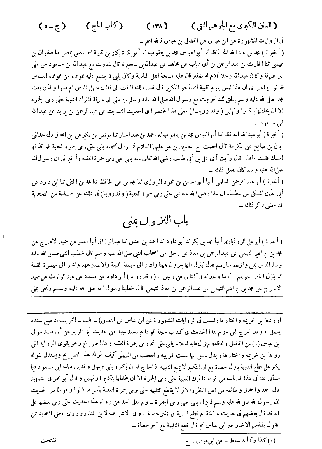 أو ردها ابن خزيمة واختارها وليست في الروايات المشهورة عن ابن عباس عن الفضل) - قلت - الغريب إذا صح سنده يعمل به وقد اخرج ابن حزم هذا الحديث في كتاب حجة الوداع بسند جيد من حديث أبى الزبير عن أبى معبد مولى ابن عباس (1) عن الفضل ولفظه ولم بزل عليه السلام يلبى حتى اتم رمى جمرة العقبة وهذا صريح وهو يقوى الرواية التى رواها ابن خزيمة واختارها ويدل على انها ليست بغريبة والعجب من البيهقى كيف يترك هذا الصريح ويستدل بقوله يكبر على قطع التلبية باول حصاة مع ان التكبير لايمنع التلبية إذ الحاج له ان يكبر ويلبى ويهلل وقد بين ذلك ابن مسعود فيما