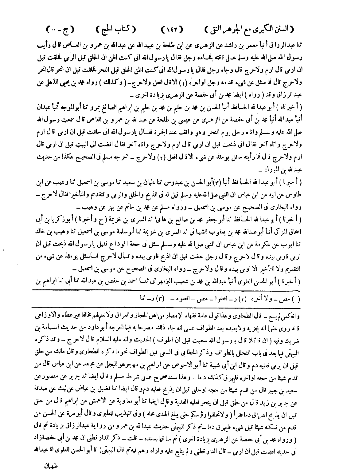 وانه كمن لم يسع - قال الطحاوي وهذا قول عامة فقهاء الامصار من اهل الحجاز والعراق ولا نعلم لهم مخالفا غير عطاء والاوزاعي فانه روى عنهما انه يجزيه ولا يعيده بعد الطواف على انه جاء ذلك مصر حابه فيما اخرجه أبو داود من حديث اسامة بن شريك وفيه (ان قائلا قال يا رسول الله سعيت قبل ان اطوف) الحديث وانه عليه السلام قال لا حرج - وقد ذكره البيهقى فيما بعد في باب التحلل بالطواف وذكر الخطابى في السعي قبل الطواف نحو ما ذكره الطحاوي وقال مالك من حلق قبل ان يرمى فعليه دم وقال ابن أبى شيبة ثنا أبو الاحوص عن ابراهيم بن مهاجر البجلى عن مجاهد عن ابن عباس قال من قدم شيئا من حجه أو اواخره فليهرق كذلك دما - وهذا سند صحيح على شرط مسلم وقال ايضا ثنا جرير عن منصور عن سعيد بن جبير قال من قدم شيئا من حجه أو حلق قبل ان يذبح فعليه دم وقال ايضا فضيل بن عياض عن ليث عن صدقة عن جابر بن زيد قال من حلق قبل ان ينحر فعليه الفدية وقال ايضا ثنا أبو معاوية عن الاعمش عن ابراهيم قال من حلق قبل ان يذبح اهراق دما فقرأ (ولا تحلقوا رؤسكم حتى يبلغ الهدى محله) وفي التهذيب للطبري وقال أبو مرة عن الحسن من قدم من نسكه شيئا قبل شئ فليهرق دما - ثم ذكر البيهقى حديث عبد الله بن عمر من رواية عبد الرزاق بزيادة ثم قال (ورواه محمد بن أبى حفصة عن الزهري بزيادة اخرى) ثم ساقها بسنده - قلت - ذكر الدارقطني ان محمد بن أبى حفصة زاد في حديثه افضت قبل ان ارمى - قال الدارقطني ولم يتابع عليه واراه وهم فيه ثم قال البيهقى (انا أبو الحسن العلوى انا عبد الله
