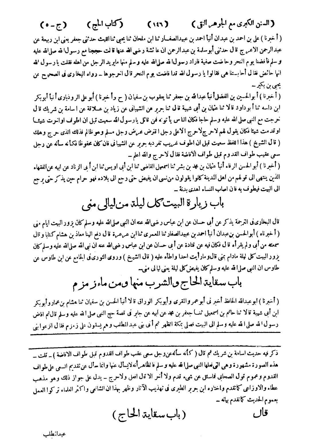 ذكر فيه حديث اسماة بن شريك ثم قال (كأنه سأله عن رجل سمى عقب طواف القدوم قبل طواف الافاضة) - قلت - هذا الصورة مشهورة وهى التى فعلها النبي صلى الله عليه وسلم فالظاهر أنه لا يسأل عنها وانما سأل عن تقديم السعي على طواف القدوم وعموم قول اصحابي فما سئل عنشئ قدم ولا أخر الاقل افعل ولا حرج - يدل على جواز ذلك وهو مذهب عطاء والاوزاعي كما تقدم واختاره ابن جرير الطبري في تهذيب الاثار وظهر بهذا ان الشافعي واكثر العلماء تركوا العمل بعموم الحديث كما تقدم بيانه - قال (باب سقاية الحاج)