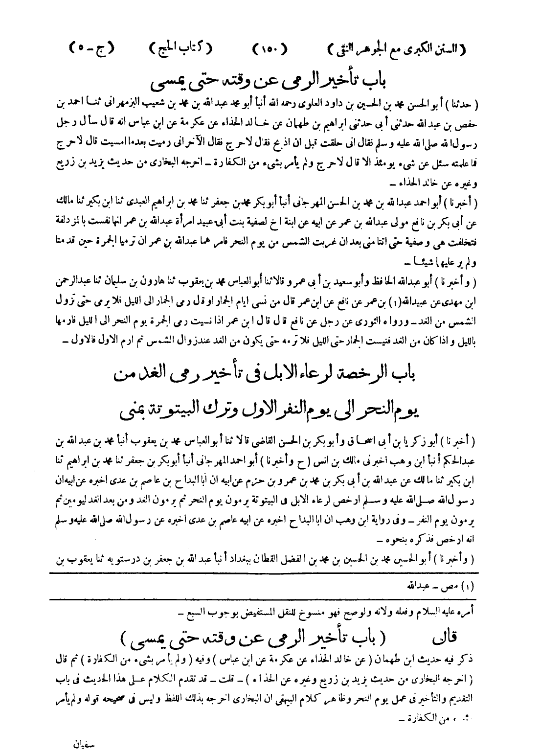 أمره عليه السلام وفعله ولانه ولو صح فهو منسوخ للنقل المستفيض بوجوب السبع - قال (باب تأخير الرمى عن وقته حتى يمسى) ذكر فيه حديث ابن طهمان (عن خالد الحذاء عن عكرمة عن ابن عباس) وفيه (ولم يأمر بشئ من الكفارة) ثم قال (اخرجه البخاري من حديث يزيد بن زريع وغيره عن الحذاء) - قلت - قد تقدم الكلام على هذا الحديث في باب التقديم والتأخير في عمل يوم النحر وظاهر كلام البيهقى ان البخاري اخرجه بذلك اللفظ وليس في صحيحه قوله ولم يأمر بشئ من الكفارة -