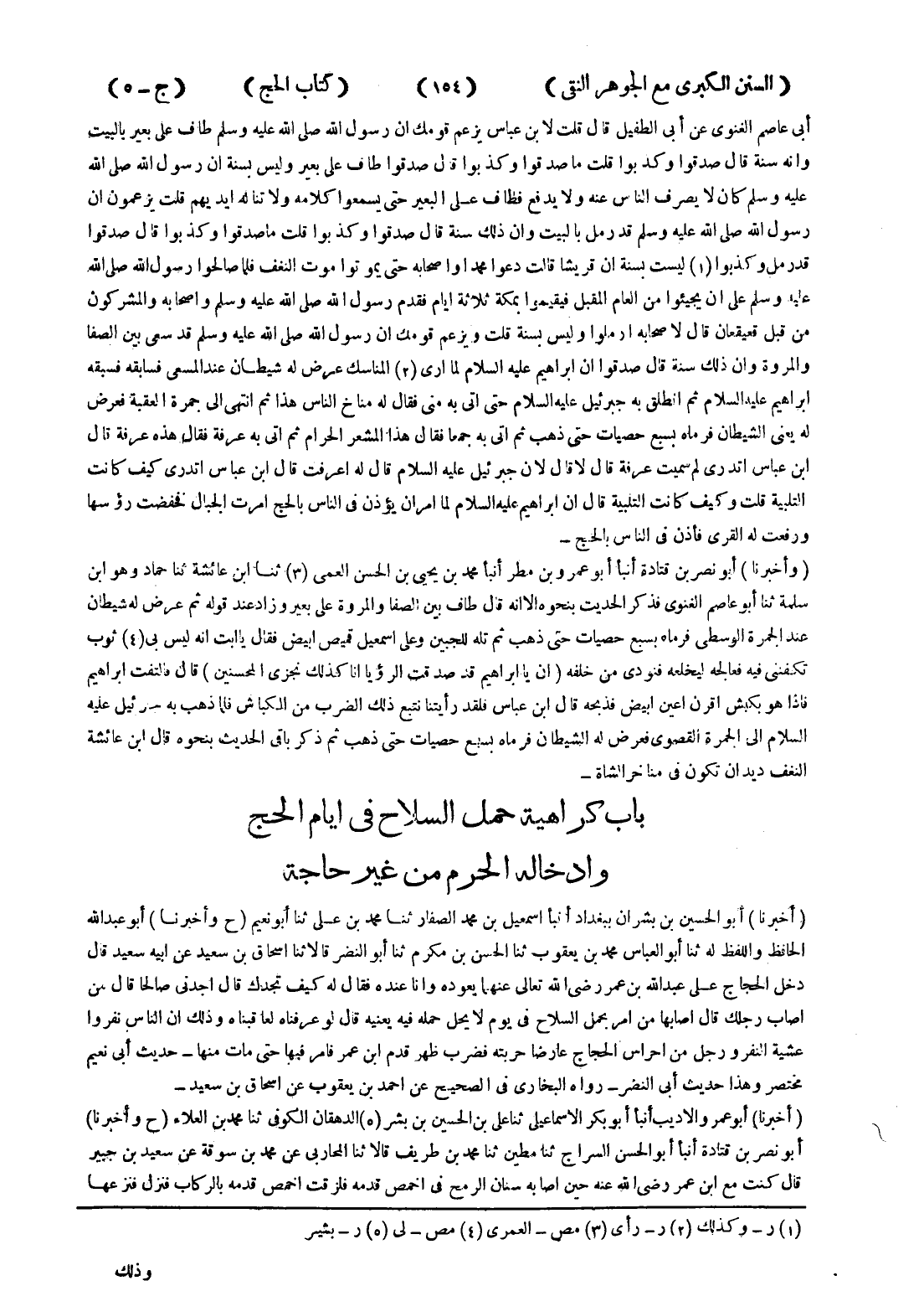 - (وأخبرنا) أبو نصر بن قتادة أنبأ أبو عمرو بن مطر أنبأ محمد بن يحيى بن الحسن العمى (3) ثنا ابن عائشة ثنا حماد وهو ابن سلمة ثنا أبو عاصم الغنوى فذكر الحديث بنحوه الا انه قال طاف بين الصفا والمروة على بعير وزاد عند قوله ثم عرض له شيطان عند الجمرة السوطى فرماه بسبع حصيات حتى ذهب ثم تله للجبين وعلى اسمعيل قميص ابيض فقال يا ابت انه ليس بى (4) ثوب تكفننى فيه فعالجه ليخلعه فنودى من خلفه (ان يا ابراهيم قد صدقت الرؤيا انا كذلك نجزى المحسنين) قال فالتفت ابراهيم فإذا هو بكبش اقرن اعين ابيض فذبحه قال ابن عباس فلقد رأيتنا نتبع ذلك الضرب من الكباش فلما ذهب به جبرئيل عليه السلام إلى الجمرة القصوى فعرض له الشيطان فرماه بسبع حصيات حتى ذهب ثم ذكر باقى الحديث بنحوه قال ابن عائشة النغف دى ان تكون في مناخر الشاة