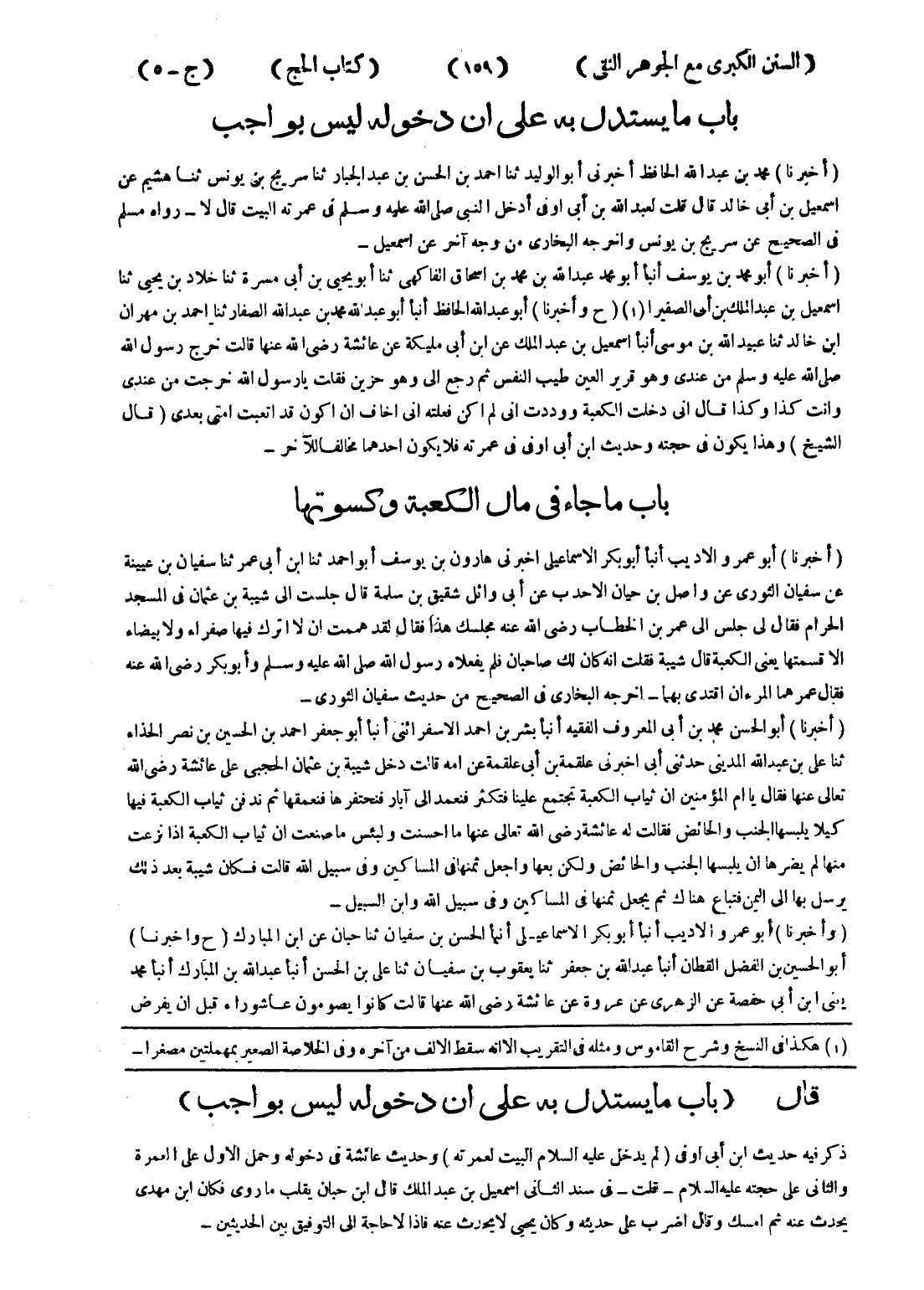 قال (باب ما يستدل به على ان دخوله ليس بواجب) ذكر فيه حديث ابن أبى أو في (لم يدخل عليه السلام البيت لعمرته) وحديث عائشة في دخوله وحمل الاول على العمرة والثانى على حجته عليه السلام - قلت - في سند الثاني اسمعيل بن عبد الملك قال ابن حبان يقلب ما روى فكان ابن مهدى يحدث عنه ثم امسك وقال اضرب على حديثه وكان يحيى لا يحدث عنه فإذا لا حاجة إلى التوفيق بين الحديثين -