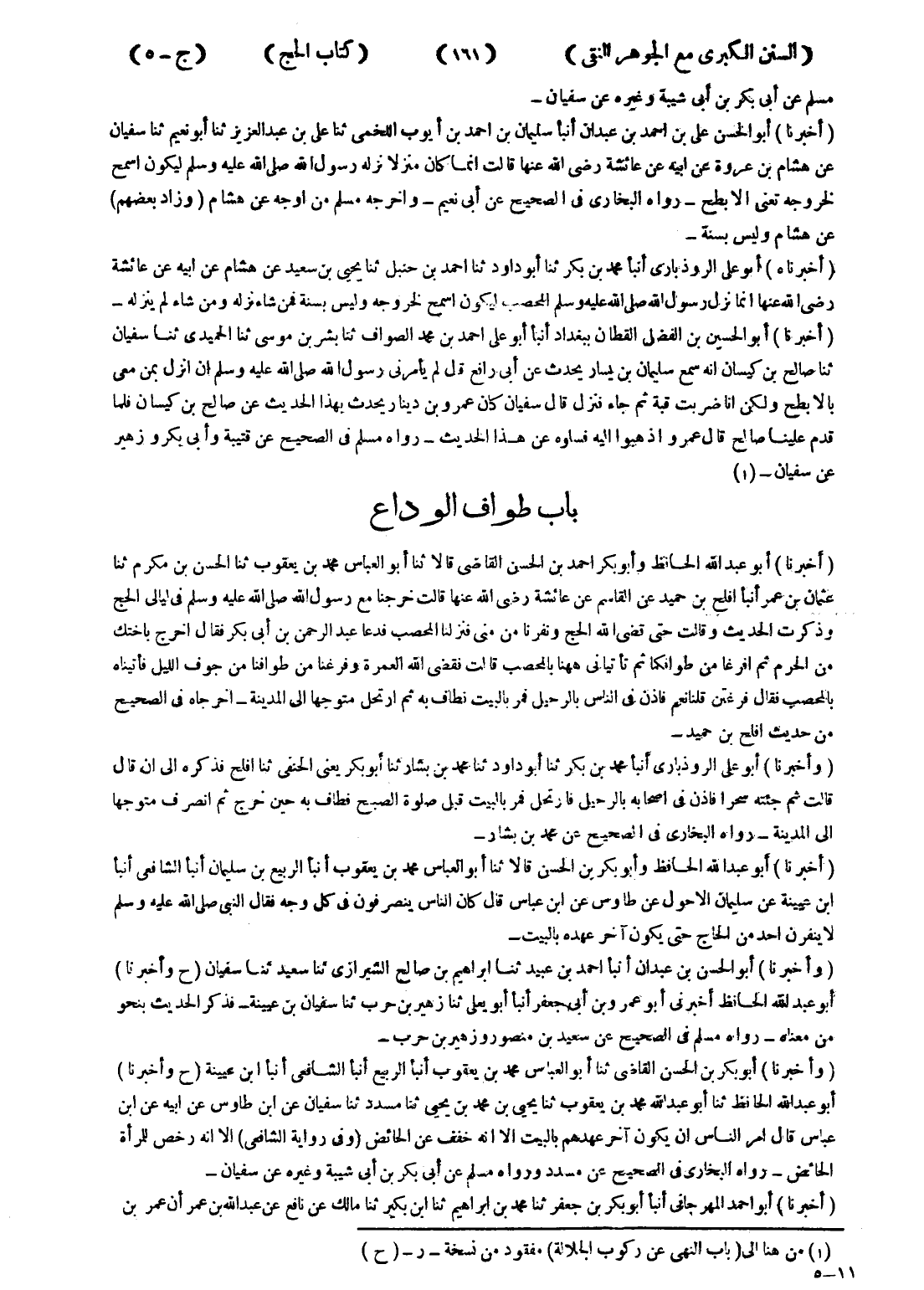 - (وأخبرنا) أبو على الروذبارى أنبأ محمد بن بكر ثنا أبو داود ثنا محمد بن بشار ثنا أبو بكر يعنى الحنفي ثنا افلح فذكره إلى ان قال قالت ثم جئته سحرا فاذن في اصحابه بالرحيل فارتحل فمر بالبيت قبل صلوة الصبح فطاف به حين خرج ثم انصرف متوجها إلى المدينة - رواه البخاري في الصحيح عن محمد بن بشار