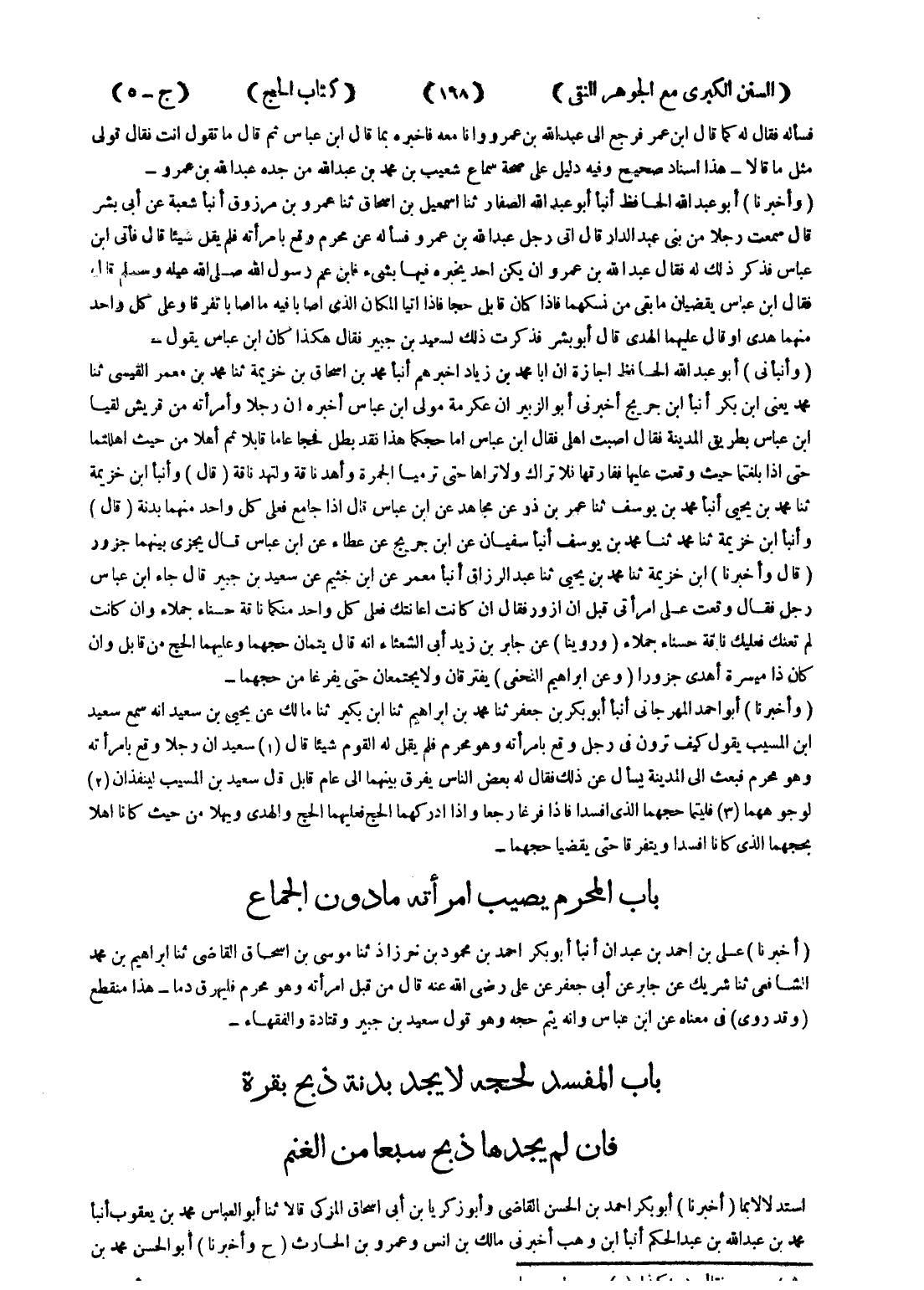- (وأخبرنا) أبو عبد الله الحافظ أنبأ أبو عبد الله الصفار ثنا اسمعيل بن اسحق ثنا عمرو بن مرزوق أنبأ شعبة عن أبى بشر قال سمعت رجلا من بنى عبدالدار قال اتى رجل عبد الله بن عمرو فسأله عن محرم وقع بامرأته فلم يقل شيئا قال فأتى ابن عباس فذكر ذلك له فقال عبد الله بن عمرو ان يكن احد يخبره فيها بشئ فابن عم رسول الله صلى الله عليه وسلم قال فقال ابن عباس يقضيان ما بقى من نسكهما فإذا كان قابل حجا فإذا اتيا المكان الذى اصابا فيه ما اصابا تفرقا وعلى كل واحد منهما هدى أو قال عليهما الهدى قال أبو بشر فذكرت ذلك لسعيد بن جبير فقال هكذا كان ابن عباس يقول - (وأنبأني) أبو عبد الله الحافظ اجازة ان ابا محمد بن زياد اخبرهم أنبا محمد بن اسحاق بن خزيمة ثنا محمد بن معمر القيسي ثنا محمد يعنى ابن بكر أنبأ ابن جريج أخبرني أبو الزبير ان عكرمة مولى ابن عباس أخبره ان رجلا وأمرأته من قريش لقيا ابن عباس بطريق المدينة فقال اصبت اهلي فقال ابن عباس اما حجكما هذا فقد بطل فحجا عاما قابلا ثم أهلا من حيث اهللتما حتى إذا بلغتما حيث وقعت عليها ففارقها فلاتراك ولا تراها حتى ترميا الجمرة وأهد ناقة ولتهد ناقة (قال) وأنبأ ابن خزيمة ثنا محمد بن يحيى أنبأ محمد بن يوسف ثنا عمر بن ذر عن مجاهد عن ابن عباس قال إذا جامع فعلى كل واحد منهما بدنة (قال) وأنبأ ابن خزيمة ثنا محمد ثنا محمد بن يوسف أنبأ سفيان عن ابن جريج عن عطاء عن ابن عباس قال يجزى بينهما جزور (قال وأخبرنا) ابن خزيمة ثنا محمد بن يحيى ثنا عبد الرزاق أنبأ معمر عن ابن خثيم عن سعيد بن جبير قال جاء ابن عباس رجل فقال وقعت على امرأتي قبل ان ازور فقال ان كانت اعانتك فعل كل واحد منكما ناقة حسناء جملاء وان كانت لم تعنك فعليك ناقة حسناء جملاء