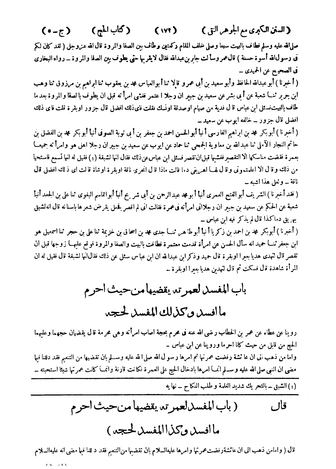 قال (باب المفسد لعمرته يقضيها من حيث احرم ما افسد وكذا المفسد لحجه) قال (واما من ذهب إلى ان عائشة رفضت عمرتها وامرها عليه السلام بان تقضيها من التنعيم فقد دللنا فيما مضى انه عليه السلام