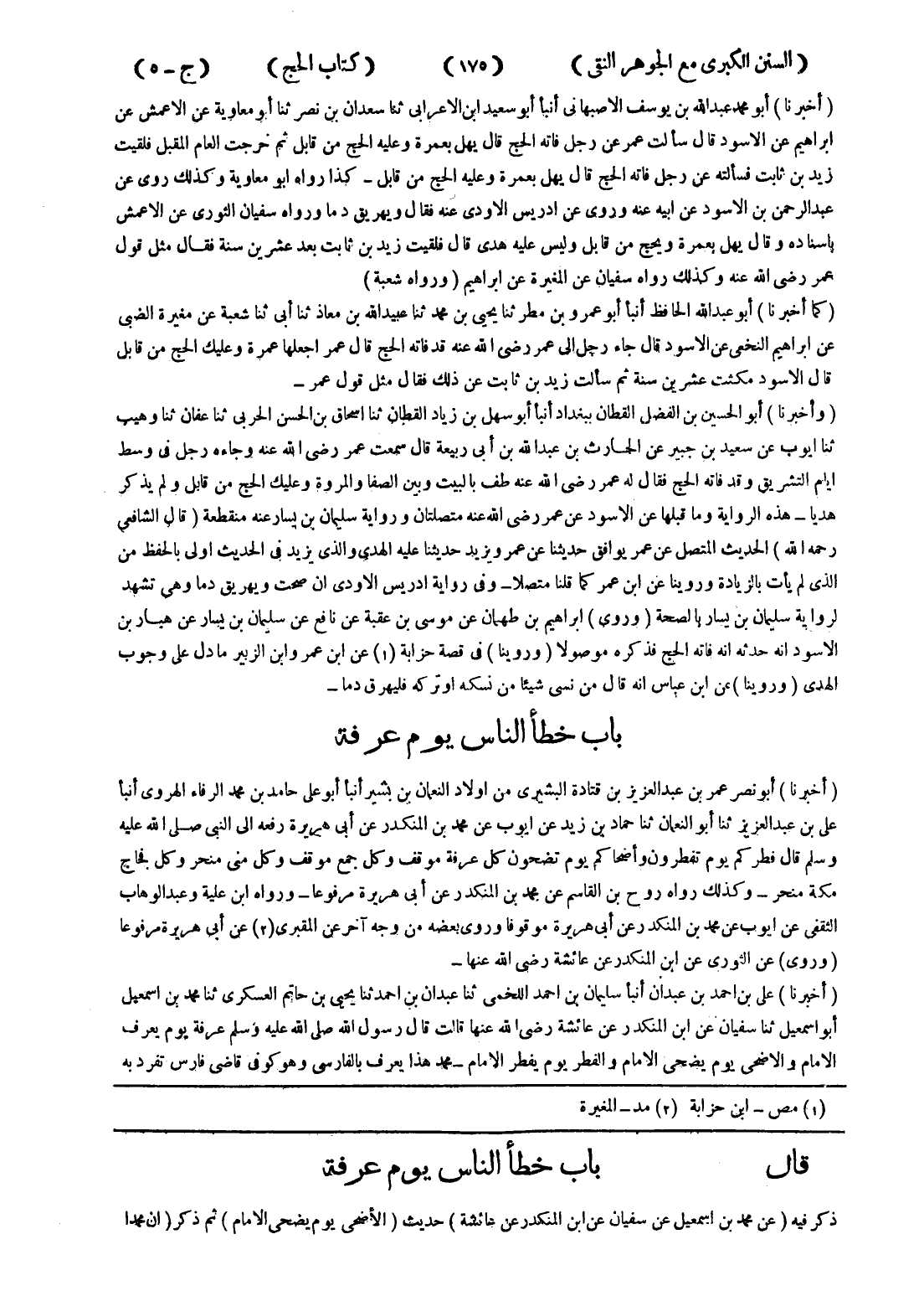 قال باب خطأ الناس يوم عرفة ذكر فيه (عن محمد بن اسمعيل عن سفيان عن ابن المنكدر عن عائشة) حديث (ألا ضحى يوم يضحى الامام) ثم ذكر (ان محمدا