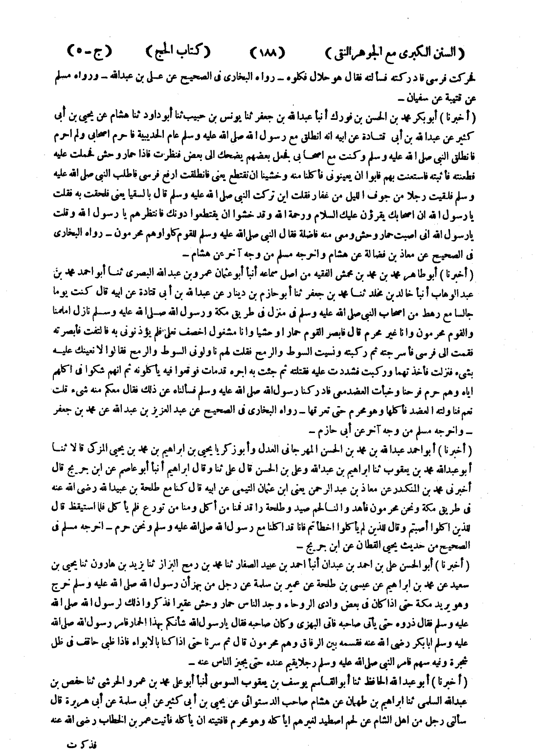 - (أخبرنا) أبو الحسن على بن احمد بن عبدان أنبأ احمد بن عبيدالصفار ثنا محمد بن رمح البزاز ثنا يزيد بن هارون ثنا يحيى بن سعيد عن محمد بن ابراهيم عن عيسى بن طلحة عن عمير بن سلمة عن رجل بن بهز أن رسول الله صلى الله عليه وسلم خرج وهو يريد مكة حتى إذا كان في بعض وادى الروحاء وجد الناس حمار وحش عقيرا فذكروا ذلك لرسول الله صلى الله عليه وسلم فقال ذروه حتى يأتي صاحبه فاتى البهزى وكان صاحبه فقال يا رسول الله شأنكم بهذا الحمار فامر رسول الله صلى الله عليه وسلم ابا بكر رضى الله عنه فقسمه بين الرفاق وهم محرمون قال ثم سرنا حتى إذا كنا بالابواء فإذا ظبى حاقف في ظل شجرة وفيه سهم فامر النبي صلى الله عليه وسلم رجلا يقيم عنده حتى يجيز الناس عنه - (أخبرناه) أبو عبد الله الحافظ ثنا أبو القاسم يوسف بن يعقوب السوسى أنبأ أبو على محمد بن عمرو الحرشى ثنا حفص بن عبد الله السلمى ثنا ابراهيم بن طهمان عن هشام صاحب الدستوائى عن يحيى بن أبى كثير عن أبى سلمة عن أبى هريرة قال سألني رجل من اهل الشام عن لحم اصطيد لغيرهم ايأكله وهو محرم فافتيته ان يأكله فأتيت عمر بن الخطاب رضى الله عنه