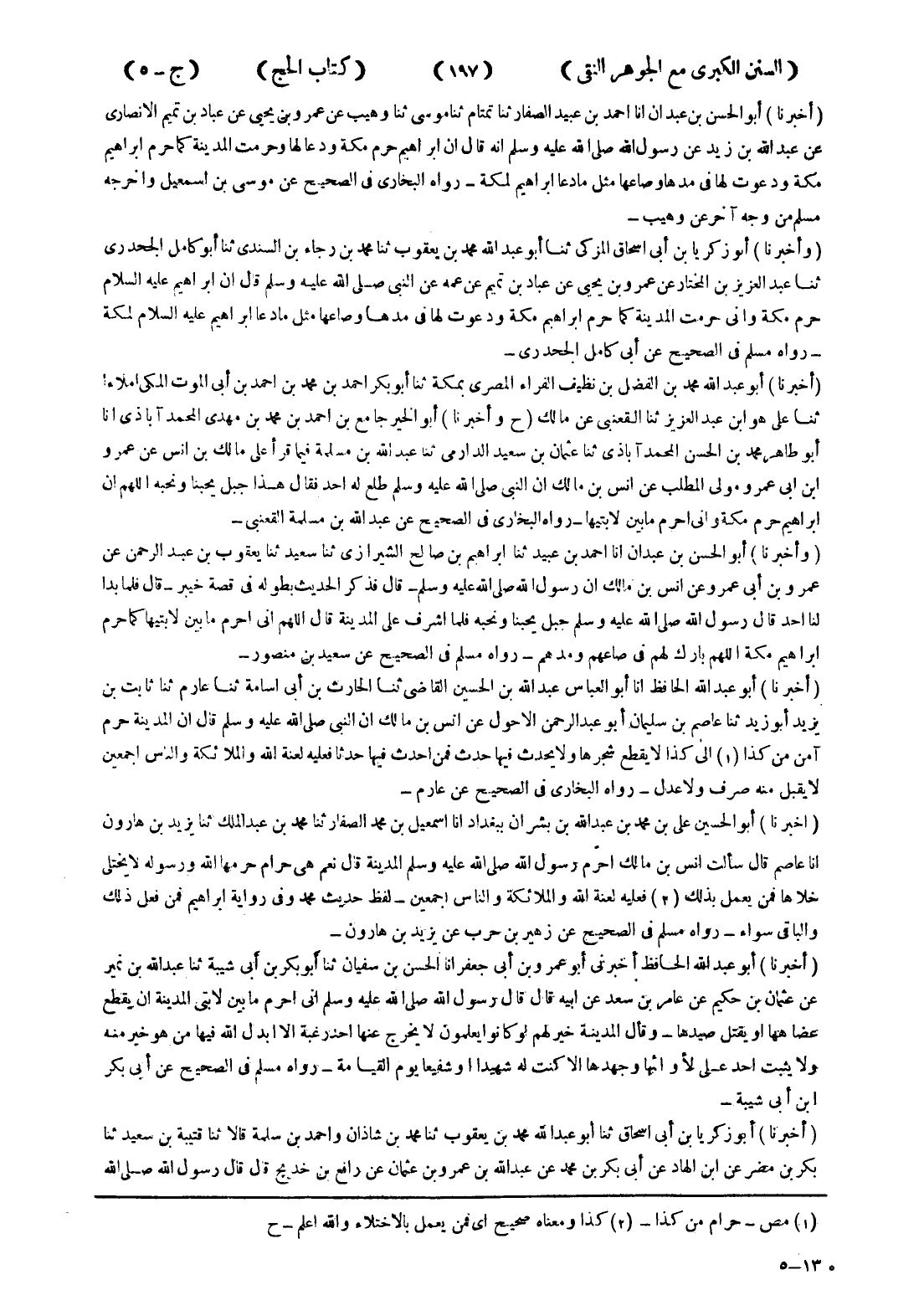 - (أخبرنا) أبو الحسين على بن محمد بن عبد الله بن بشران ببغداد انا اسمعيل بن محمد الصفار ثنا محمد بن عبد الملك ثنا يزيد بن هارون انا عاصم قال سألت انس بن مالك احرم رسول الله صلى الله عليه وسلم قال نعم هي حرام حرمها الله ورسوله لا يختلى خلاها فمن يعمل بذلك (2) فعليه لعنة الله والملائكة والناس اجمعين - لفظ حديث محمد وفي رواية ابراهيم فمن فعل ذلك والباقى سواء - رواه مسلم في الصحيح عن زهير بن حرب عن يزيد بن هارون