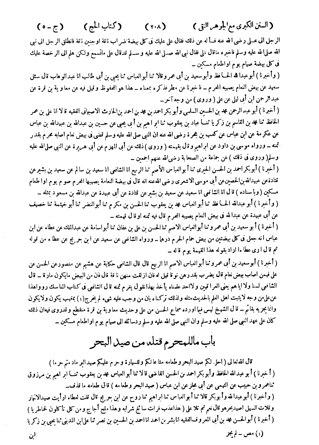 - (أخبرنا) أبو عبد الرحمن محمد بن الحسين السلمى وأبو بكر احمد بن محمد بن احمد بن الحارث الاصبهاني الفقيه قالا انا على بن عمر الحافظ ثنا محمد بن القاسم بن زكريا ثنا عباد بن يعقوب ثنا ابراهيم بن ابى يحيى عن حسين بن عبد الله بن عبيدالله بن عباس عن عكرمة عن ابن عباس عن كعب بن عجرة رضى الله عنه ان النبي صلى الله عليه وسلم قضى في بيض نعام اصابه محرم بقدر ثمنه - ورواه موسى بن داود عن ابراهيم وقال بقيمته (وروى) ذلك على أبى المهزم عن أبى هريرة عن النبي صلى الله عليه وسلم (وروى في ذلك) عن جماعة من الصحابة رضى الله عنهم اجمعين