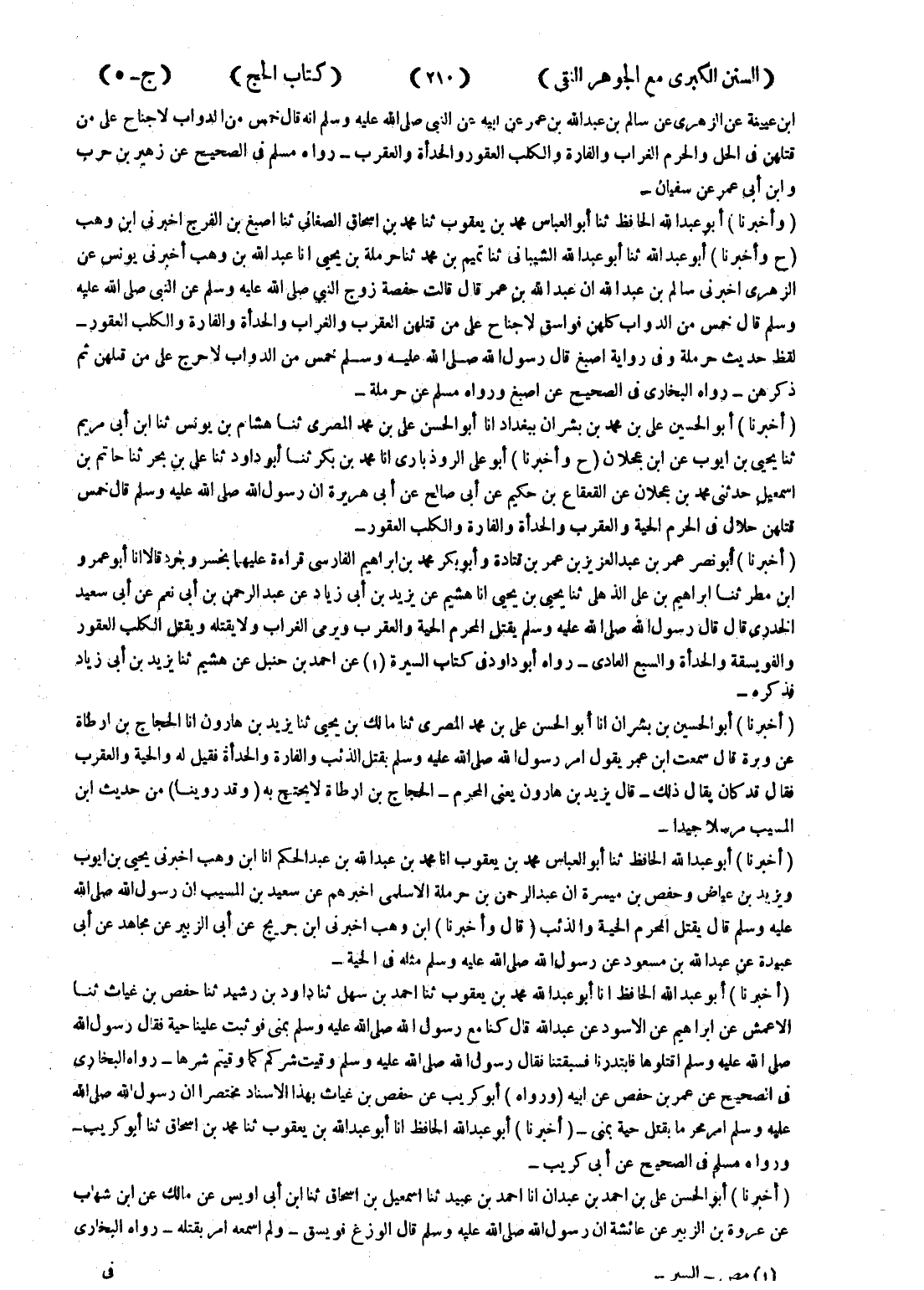 (ح وأخبرنا) أبو على الروذبارى انا محمد بن بكر ثنا أبو داود ثنا على بن بحر ثنا حاتم بن اسمعيل حدثنى محمد بن عجلان عن القعقاع بن حكيم عن أبى صالح عن أبى هريرة ان رسول الله صلى الله عليه وسلم قال خمس قتلهن حلال في الحرم الحية والعقرب والحدأة والفارة والكلب العقور
