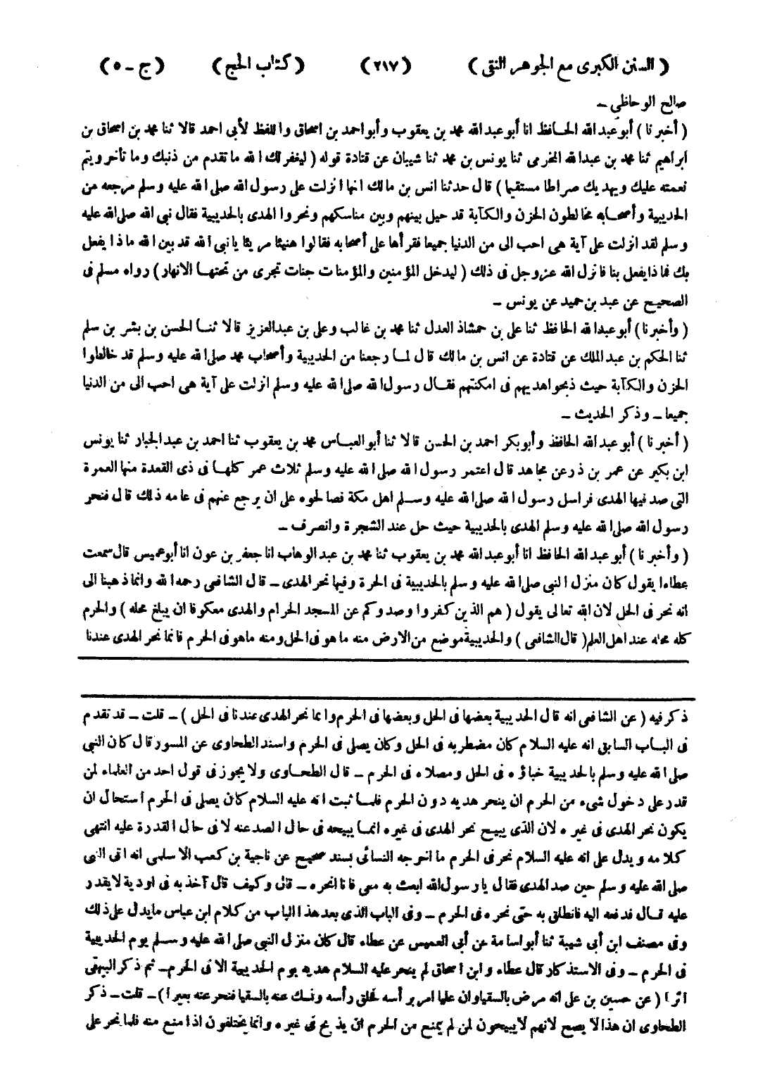 ذكر فيه (عن الشافعي انه قال الحديبية بعضها في الحل وبعضها في الحرم وانما نحر الهدى عندنا في الحل) - قلت - قد تقدم في الباب السابق انه عليه السلام كان مضطربه في الحل وكان يصلى في الحرم واسند الطحاوي عن المسور قال كان النبي صلى الله عليه وسلم بالحديبية خباؤه في الحل ومصلاه في الحرم - قال الطحاوي ولا يجوز في قول احد من العلماء لمن قدر على دخول شئ من الحرم ان ينحر هديه دون الحرم فلما ثبت انه عليه السلام كان يصلى في الحرم استحال ان يكون نحر الهدى في غيره لان الذى يبيح نحر الهدى في غيره انما يبيحه في حال الصدعنه لا في حال القدرة عليه انتهى كلامه ويدل على انه عليه السلام نحر في الحرم ما اخرجه النسائي بسند صحيح عن ناجية بن كعب الاسلمي انه اتى النبي صلى الله عليه وسلم حين صد الهدى فقال يا رسول الله ابعث به معى فانا انحره - قال وكيف قال آخذ به في اودية لا يقدر عليه قال فدفعه إليه فانطلق به حتى نحره في الحرم - وفي الباب الذى بعد هذا الباب من كلام ابن عباس ما يدل على ذلك وفي مصنف ابن أبى شيبة ثنا أبو اسامة عن أبى العميس عن عطاء قال كان منزل النبي صلى الله عليه وسلم يوم الحديبية في الحرم - وفي الاستذكار قال عطاء وابن اسحاق لم ينح؟؟ ر عليه السلام هدية يوم الحديبية الا في الحرم - ثم ذكر البيهقى اثرا (عن حسين بن على انه مرض بالسقيا وان عليا امر برأسه فحلق رأسه ونسك عنه بالسقيا فنحر عنه بعيرا) - قلت - ذكر الطحاوي ان هذا لا يصح لانهم لا يبيحون لمن لم يمنع من الحرم ان يذبح في غيره وانما يختلفون إذا منع منه فلما انحر على