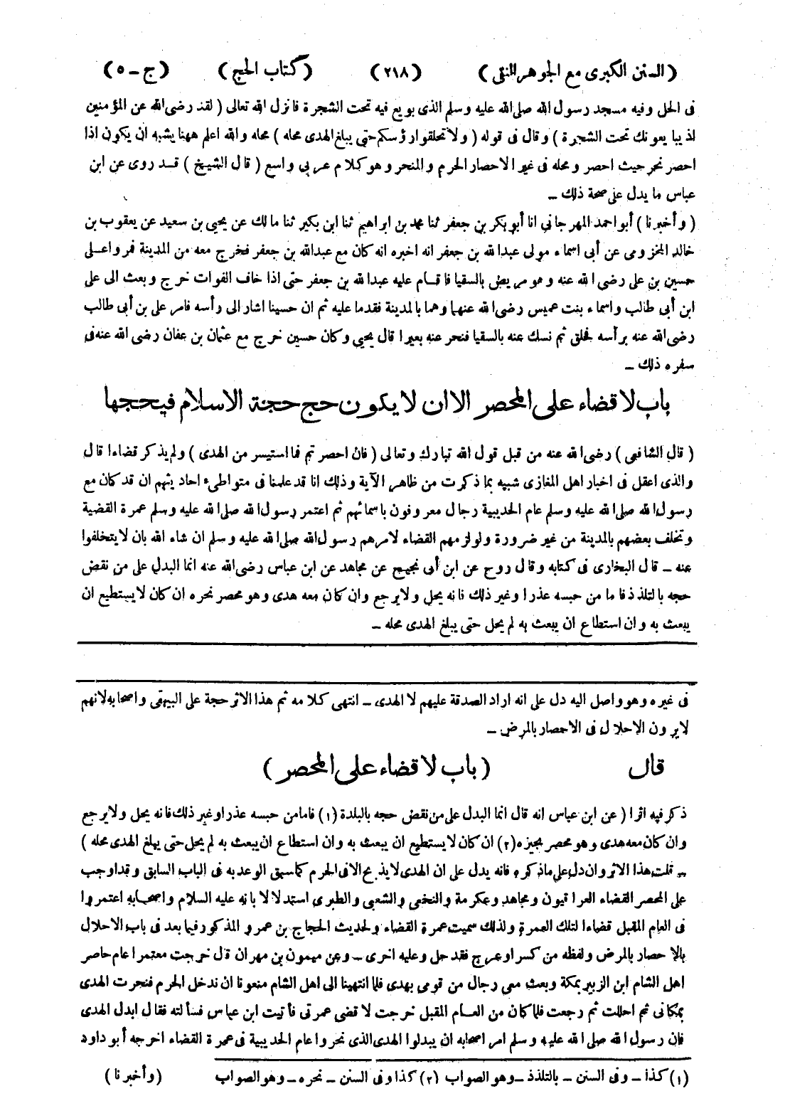 في غيره وهو واصل إليه دل على انه اراد الصدقة عليهم لا الهدى - انتهى كلامه ثم هذا الاثر حجة على البيهقى واصحابه لانهم لا يرون الا حلال في الا حصار بالمرض - قال (باب لا قضاء على المحصر) ذكر فيه اثرا (عن ابن عباس انه قال انما البدل على من نقض حجه بالبلدة (1) فاما من حبسه عذر أو غير ذلك فانه يحل ولا يرجع وان كان معه هدى وهو محصر بجيزه (2) ان كان لا يستطيع ان يبعث به وان استطاع ان يبعث به لم يحل حتى يبلغ الهدى محله) - قلت هذا الاثر وان دل على ما ذكره فانه يدل على ان الهدى لا يذبح الا في الحرم كما سبق الوعد به في الباب السابق وقد اوجب على المحصر القضاء العراقيون ومجاهد وعكرمة والنخعي والشعبى والطبري استدلالا بانه عليه السلام واصحابه اعتمروا