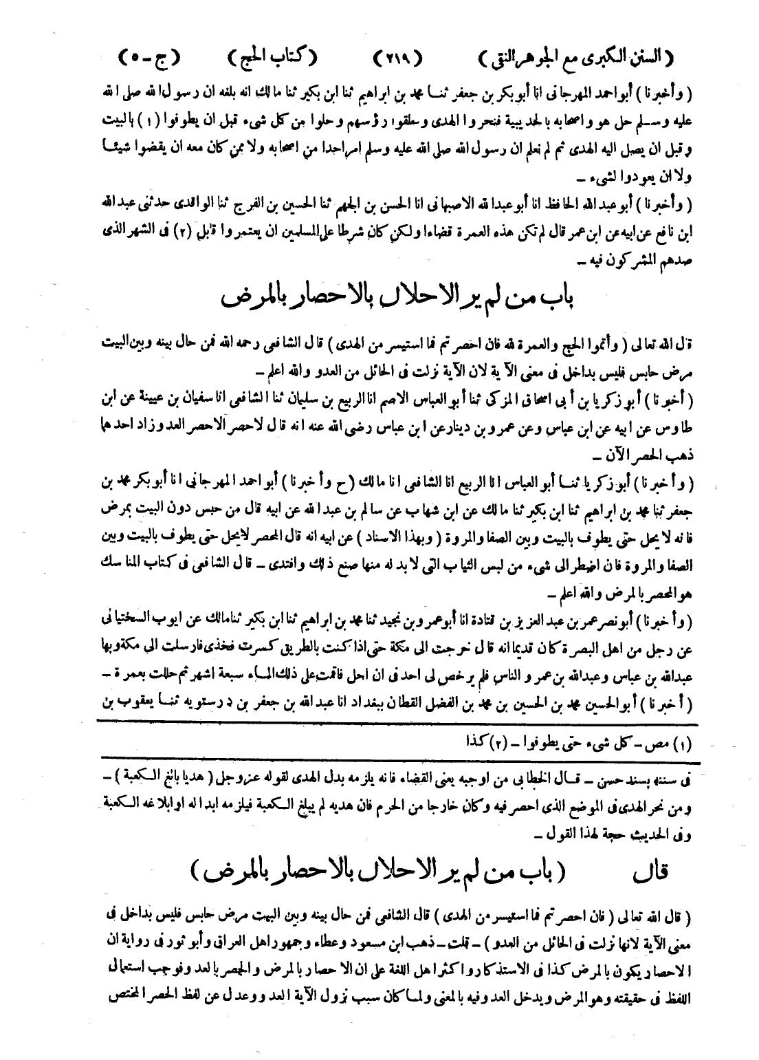 في سننه بسند حسن - قال الخطابى من اوجبه يعنى القضاء فانه يلزمه بدل الهدى لقوله عزوجل (هديا بالغ الكعبة) - ومن نحر الهدى في الموضع الذى احصر فيه وكان خارجا من الحرم فان هديه لم يبلغ الكعبة فيلزمه ابدا له أو ابلاغه الكعبة وفي الحديث حجة لهذا القول - قال (باب من لم ير الاحلال بالاحصار بالمرض) (قال الله تعالى (فان احصر تم فما استيسر من الهدى) قال الشافعي فمن حال بينه وبين البيت مرض حابس فليس بداخل في معنى الاية لانها نزلت في الحائل من العدو) - قلت - ذهب ابن مسعود وعطاء وجمهور اهل العراق وأبو ثر في رواية ان الاحصار يكون بالمرض كذا في الاستذكار واكثر اهل اللغة على ان الاحصار بالمرض والحصر بالعد وفوجب استعمال اللفظ في حقيقته وهو المرض ويدخل العدو فيه بالمعنى ولما كان سبب نزول الاية العدو وعدل عن لفظ الحصر المختص