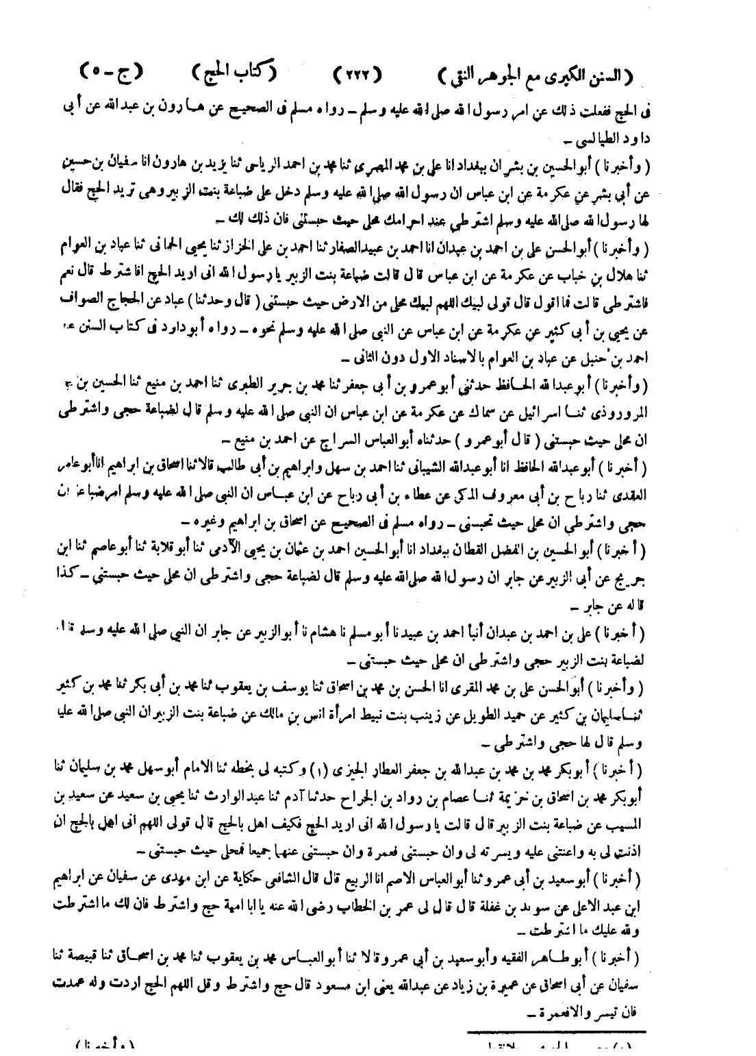 - (أخبرنا) أبو الحسين بن الفضل القطان ببغداد انا أبو الحسين بن احمد بن عثمان يحيى الادمى ثنا أبو قلابة ثنا أبو عاصم ثنا ابن جريج عن أبى الزبير عن جابر ان رسول الله صلى الله عليه وسلم قال لضباعة حجى واشترطي ان محلى حيث حبستنى - كذا قاله عن جابر