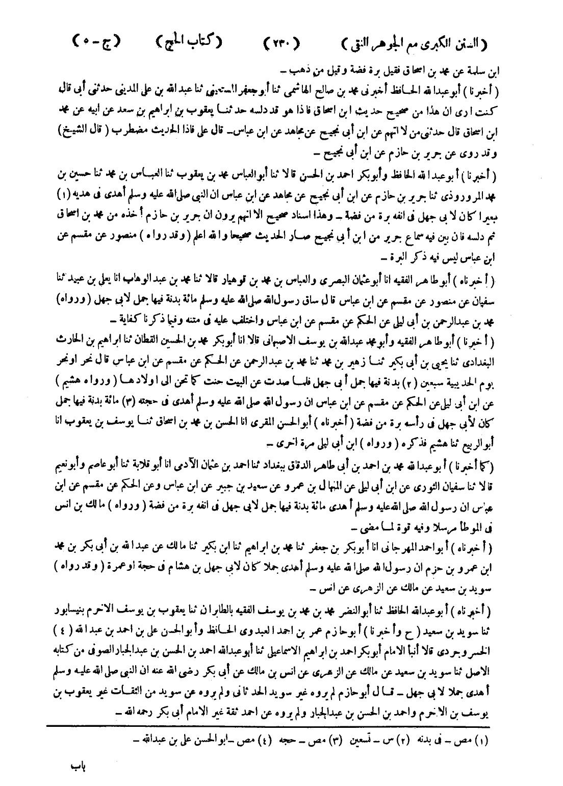 - (أخبرنا) أبو طاهر الفقيه وأبو محمد عبد الله بن يوسف الاصبهاني قالا انا أبو بكر محمد بن الحسين القطان ثنا ابراهيم بن الحارث البغدادي ثنا يحيى بن أبى بكير ثنا زهير بن محمد ثنا محمد بن عبد الرحمن عن الحكم عن مقسم عن ابن عباس قال نحر أو نحر يوم الحديبية سبعين بدنة فيها جمل أبى جهل فلما صدت عن البيت حنت كما تحن إلى اولائها (ورواه هشيم) عن ابن أبى ليلى عن الحكم عن مقسم عن ابن عباس ان رسول الله صلى الله عليه وسلم أهدى في حجته (3) مائة بدنة فيها جمل كان لابي جهل في رأسه برة من فضة (أخبرناه) أبو الحسن المقرى انا الحسن بن محمد بن اسحاق ثنا يوسف بن يعقوب انا أبو الربيع ثنا هشيم فذكره (ورواه) ابن ابى ليلى مرة اخرى (كما أخبرنا) أبو عبد الله محمد بن احمد بن أبى طاهر الدقاق ببغداد ثنا احمد بن عثمان الادمى انا أبو قلابة ثنا أبو عاصم وأبو نعيم قالا ثنا سفيان الثوري عن ابن أبى ليلى عن المنهال بن عمرو عن سعيد بن جبير عن ابن عباس وعن الحكم عن مقسم عن ابن عباس ان رسول الله صلى الله عليه وسلم أهدى مائة بدنة فيها جمل لابي جهل في انفه برة من فضة (ورواه) مالك بن انس في الموطأ مرسلا وفيه قوة لما مضى - (أخبرناه) أبو أحمد المهرجانى ان أبو بكر بن جعفر ثنا محمد بن ابراهيم ثنا ابن بكير ثنا مالك عن عبد الله بن أبي بكر بن محمد ابن عمرو بن حزم ان رسول الله صلى الله عليه وسلم أهدى جملا كان لابي جهل بن هشام في حجة أو عمرة (وقد رواه) سويد بن سعيد عن مالك عن الزهري عن انس -