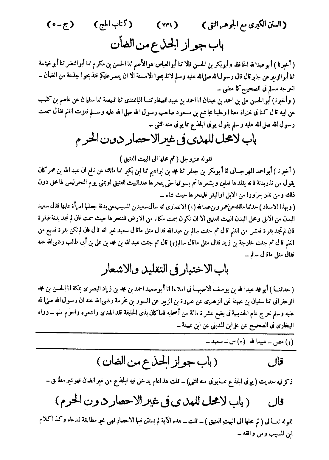 قال (باب جواز الجذع من الضان) ذكر فيه حديث (يوفى الجذع مما يوفى منه الثنى) - قلت هذا عام يدخل فيه الجذع من غير الضان فهو غير مطابق - قال (باب لا محل للهدى في غير الاحصا دون الحرم) لقوله تعالى (ثم محلها إلى البيت العتيق) - قلت - هذه الاية لم يستثن فيها الاحصار فهى غير مطابقة لمدعاه وكذا كلام ابن المسيب ومن وافقه -