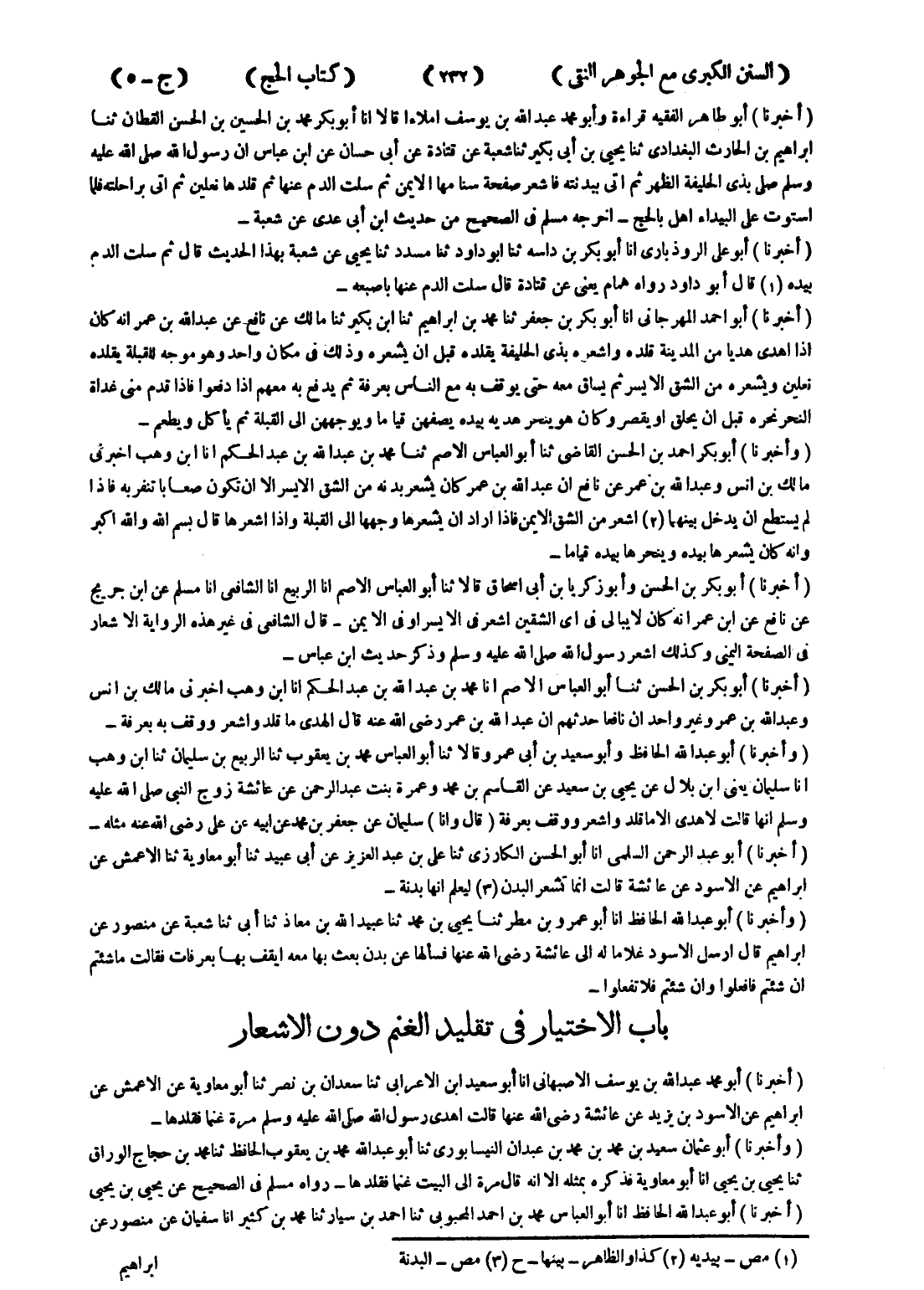 (أخبرنا) أبو طاهر الفقية قراءة وأبو محمد عبد الله بن يوسف املاءا قالا انا أبو بكر محمد بن الحسين بن الحسن القطان ثنا ابراهيم بن الحارث البغدادي ثنا يحيى بن أبى بكير ثنا شعبة عن قتادة عن أبى حسان عن ابن عباس ان رسول الله صلى الله عليه وسلم صلى بذى الحليفة الظهر ثم اتى ببدنته فاشعر صفحة سنامها الا يمن ثم سلت الدم عنها ثم قلدها نعلين ثم اتى براحلته فلما استوت على البيداء اهل بالحج - اخرجه مسلم في الصحيح من حديث ابن أبى عدى عن شعبة