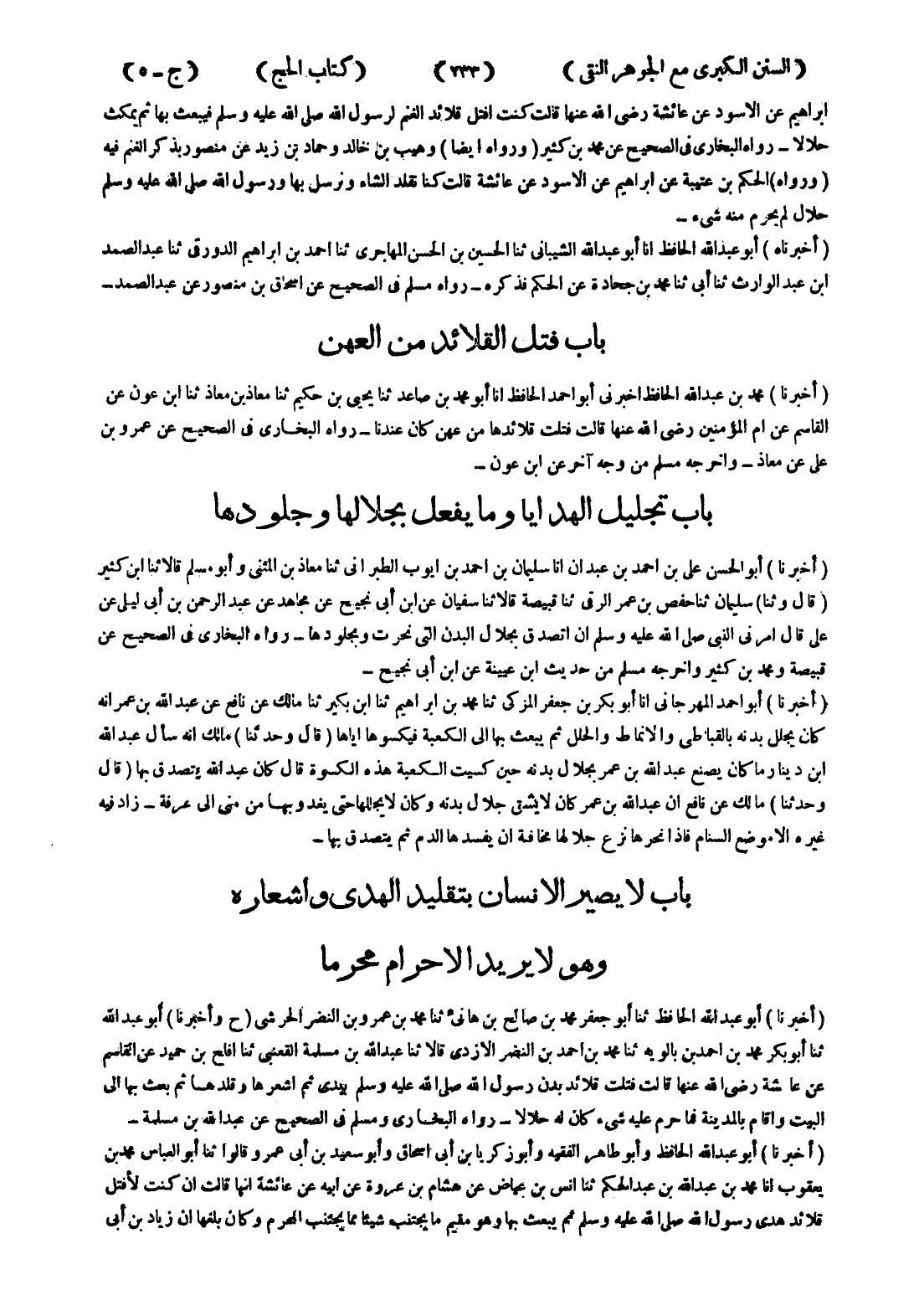 ابراهيم عن الاسود عن عائشة رضى الله عنها قالت كنت افتل قلائد الغنم لرسول الله صلى الله عليه وسلم فيبعث بها ثم يمكث حلالا - رواه البخاري في الصحيح عن محمد بن كثير (ورواه ايضا) وهيب بن خالد وحماد بن زيد عن منصور بذكر الغنم فيه (ورواه) الحكم بن عتيبة عن ابراهيم عن الاسود عن عائشة قالت كنا نقلد الشاء ونرسل بها ورسول الله صلى الله عليه وسلم حلال لم يحرم منه شئ - (أخبرناه) أبو عبد الله الحافظ انا أبو عبد الله الشيباني ثنا الحسين بن الحسن المهاجرى ثنا احمد بن ابراهيم الدورقى ثنا عبد الصمد ابن عبد الوارث ثنا أبى ثنا محمد بن جحادة عن الحكم فذكره - رواه مسلم في الصحيح عن اسحاق بن منصور عن عبد الصمد
