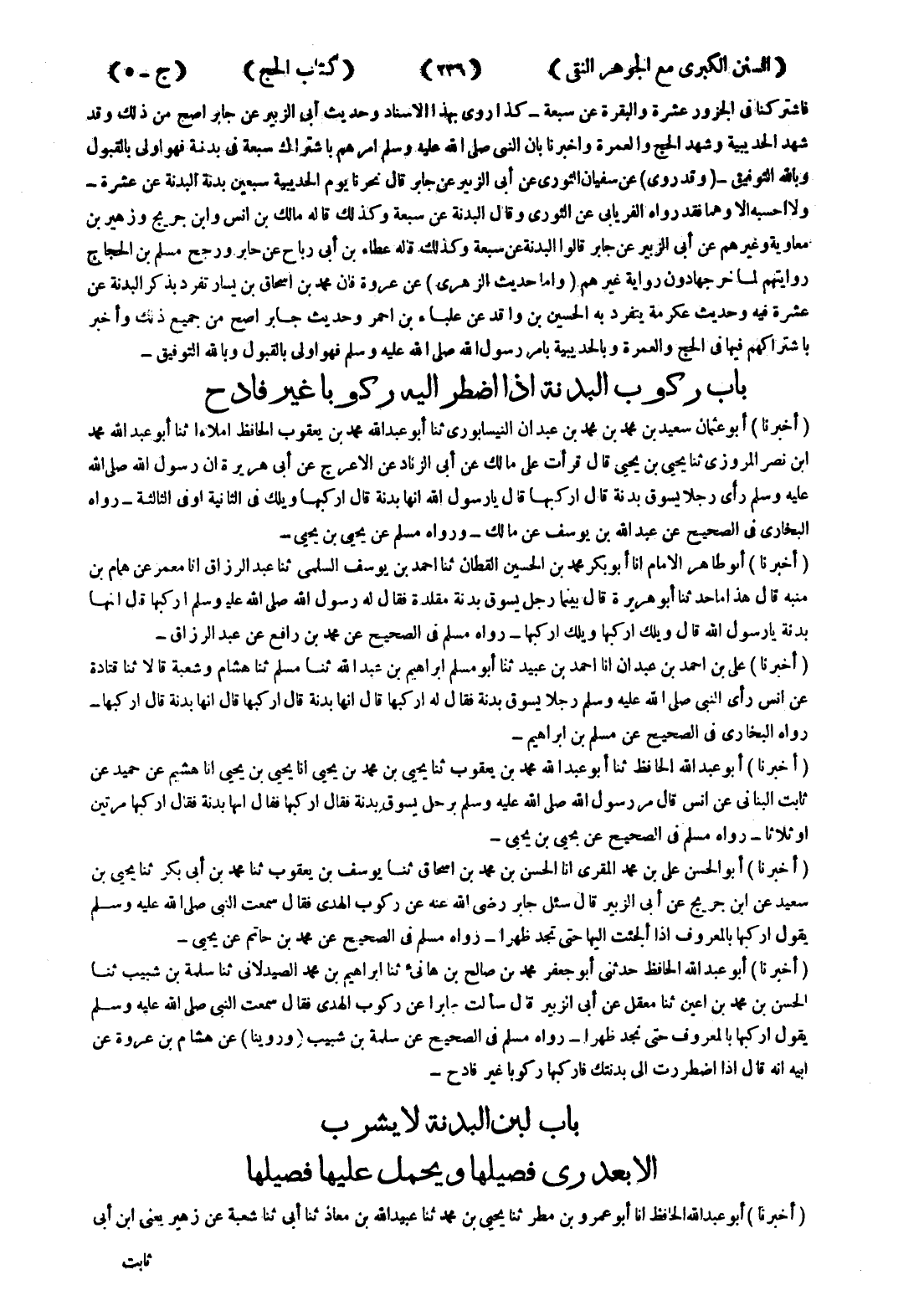 - (أخبرنا) أبو عبد الله الحافظ ثنا أبو عبد الله محمد بن يعقوب ثنا يحيى بن محمد بن يحيى انا يحيى بن يحيى انا هشيم عن حميد عن ثابت البنانى عن انس قال مر رسول الله صلى الله عليه وسلم برجل يسوق بدنة فقال اركبها فقال انها بدنة فقال اركبها مرتين أو ثلاثا - رواه مسلم في الصحيح عن يحيى بن يحيى