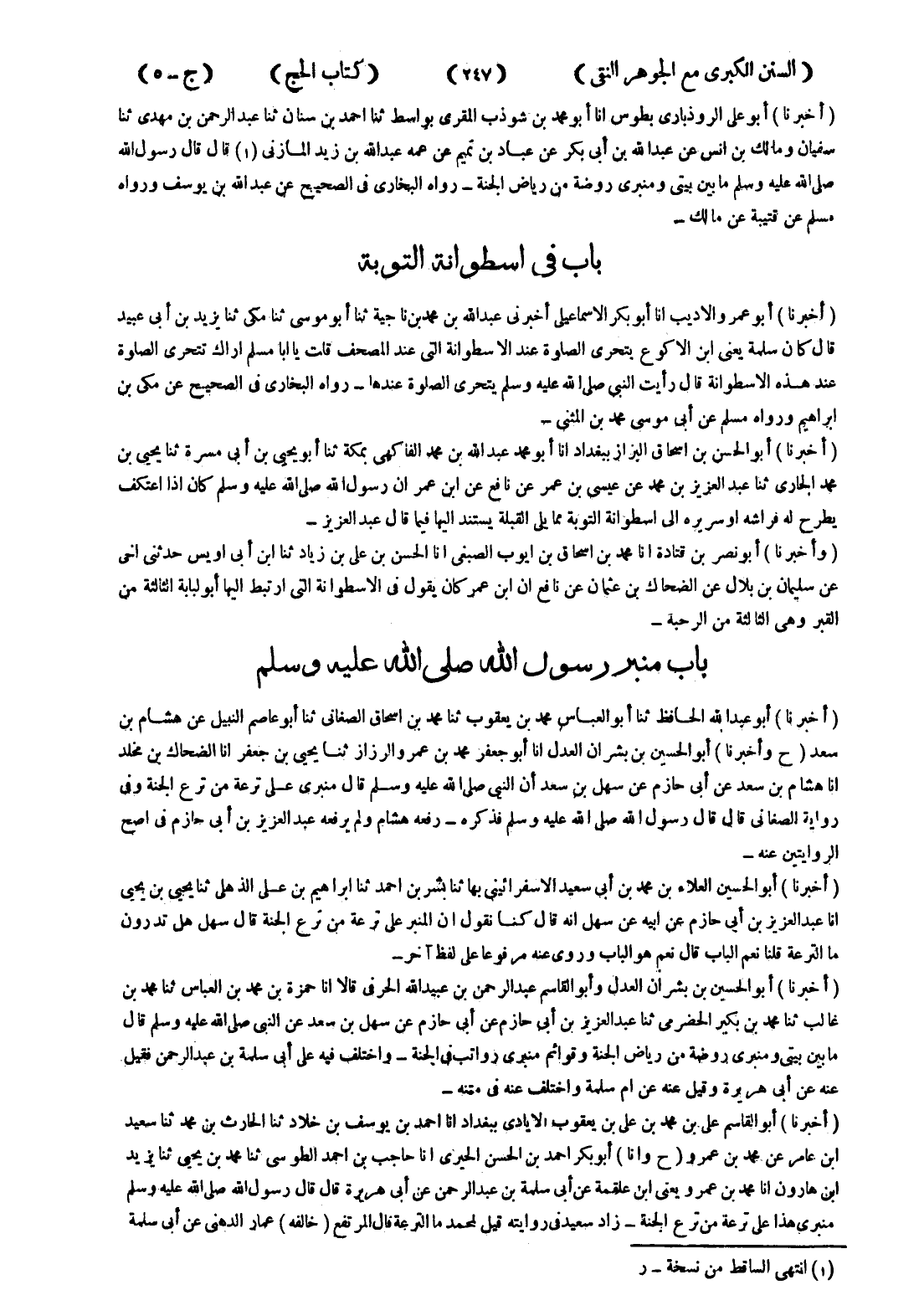 (أخبرنا) أبو عمرو الاديب انا أبو بكر اسماعيلي أخبرني عبد الله بن محمد بن ناجية ثنا أبو موسى ثنا مكى ثنا يزيد بن أبى عبيد قال كان سملة يعنى ابن الاكوع يتحرى الصلوة عند الاسطوانة التى عند المصحف قلت يا ابا مسلم اراك تتحرى الصلوة عند هذه الاسطوانة قال رأيت النبي صلى الله عليه وسلم يتحرى الصلوة عندها - رواه البخاري في الصحيح عن مكى بن ابراهيم ورواه عن أبى موسى محمد بن المثنى