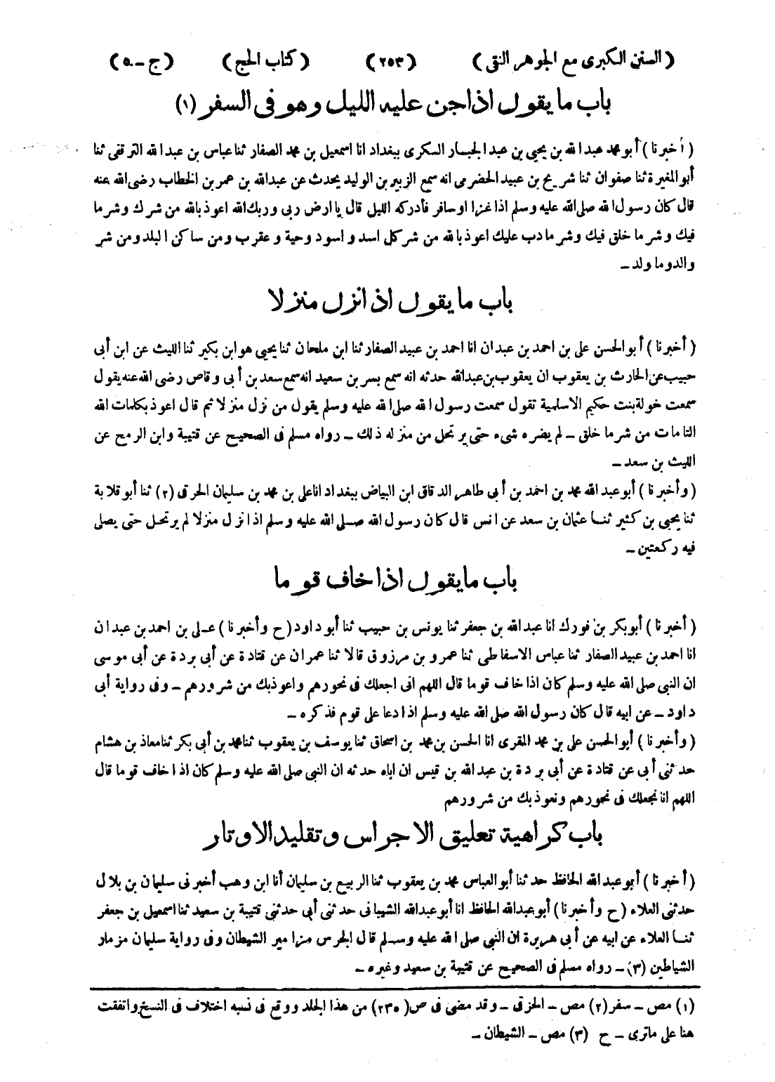 (أخبرنا) أبو محمد عبد الله بن يحيى بن عبد الجبار السكرى ببغداد انا اسمعيل بن محمد الصفار ثنا عباس بن عبد الله الترقفى ثنا أبو المغيرة ثنا صفوان ثنا شريح بن عبيد الحضرمي انه سمع الزبير بن الوليد يحدث عن عبد الله بن عمر بن الخطاب رضى الله عنه قال كان رسول الله صلى الله عليه وسلم إذا غزا أو سافر فأدركه الليل قال يا ارض ربى وربك الله اعوذ بالله من شرك وشر ما فيك وشر ما خلق فيك وشر ما دب عليك اعوذ بالله من شركل اسد واسود وحية وعقرب ومن ساكن البلد ومن شر والد وما ولد