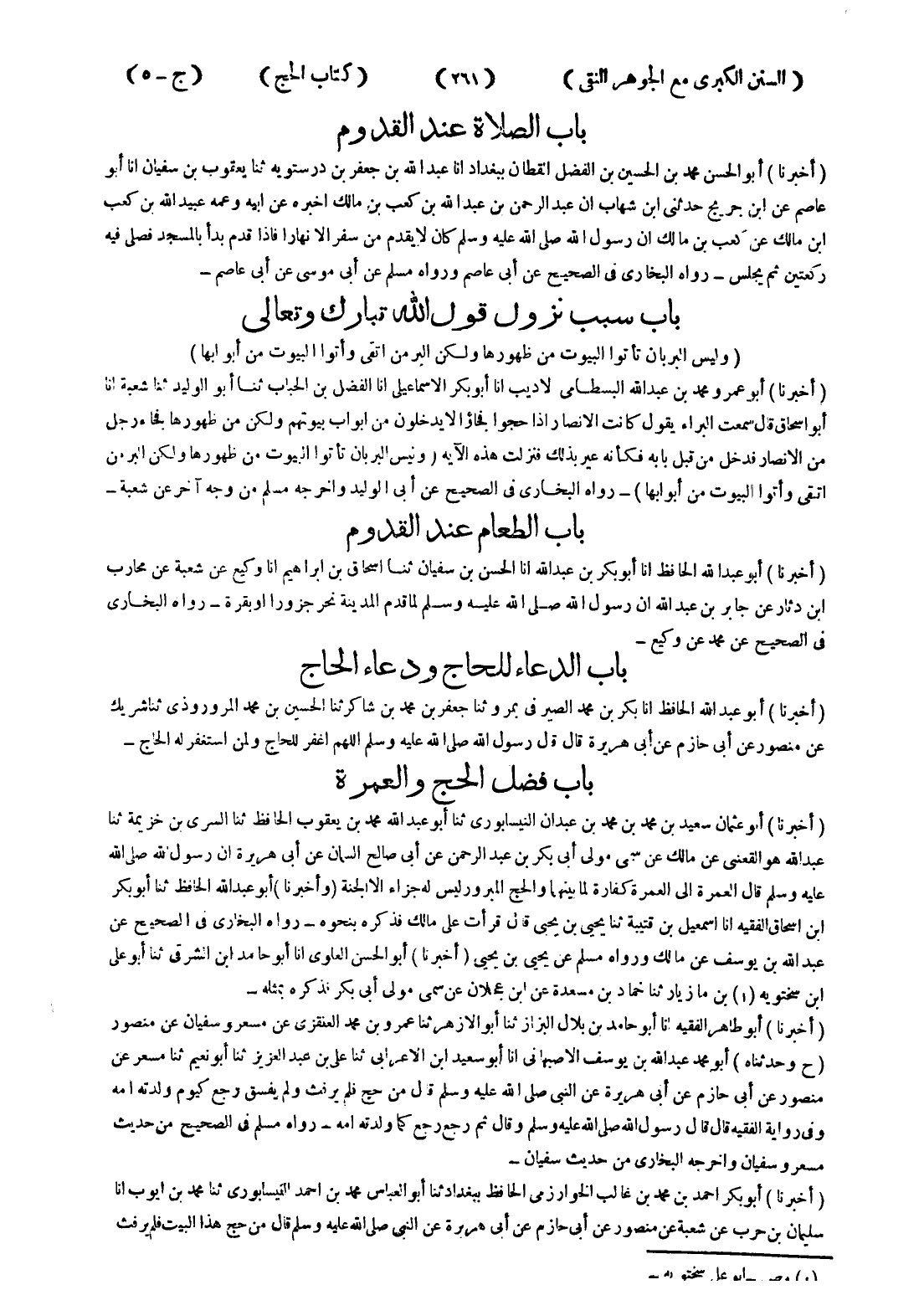 (أخبرنا) أبو عمرو محمد بن عبد الله البسطامى الاديب انا أبو بكر الاسماعيلي انا الفضل بن الحباب ثنا أبو الوليد ثنا شعبة انا أبو إسحاق قال سمعت البراء يقول كانت الانصار إذا حجوا فجاؤا لا يدخلون من أبواب بيوتهم ولكن من ظهورها فجاء رجل من الانصار فدخل من قبل بابه فكأنه عير بذلك فنزلت هذه الاية (وليس البر بان تأتوا البيوت من ظهورها ولكن البر من اتقى وأتوا البيوت من أبوابها) - رواه البخاري في الصحيح عن أبى الوليد واخرجه مسلم من وجه آخر عن شعبة