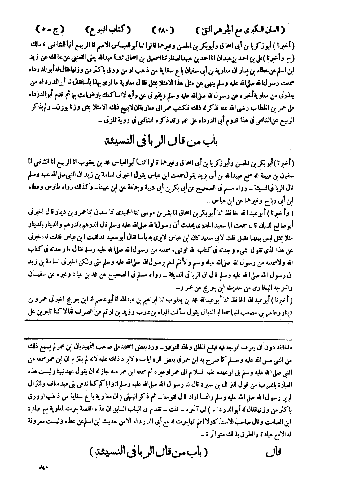 ما خلفه دون ان يعرف الوجه فيه فيقع الخلل وبالله التوفى يق - ورد بعض اصحابنا على صاحب التمهيد بان ابن عمر لم يسمع ذلك من النبي صلى الله عليه وسلم كما صرح به ابن عمر في بعض الروايات ولا يرد ذلك عليه لانه لم يلتزم ان ابن عمر سمعه من النبي صلى الله عليه وسلم بل لو عهده عليه السلام إلى عمر أو غيره ثم سمعه ابن عمر منه جاز له ان يقول عهد نبينا وليست هذه العبارة باغرب من قول النزال بن سبرة قال لنا رسول الله صلى الله عليه وسلم انا واياكم كنا ندعى بنى عبد مناف والنزال لم ير رسول الله صلى الله عليه وسلم وانما اراد قال لقومنا - ثم ذكر البيهقى ان معاوية باع سقاية من ذهب أو ورق باكثر من وزنها فقال له أبو الدرداء) إلى آخره - قلت - تقدم في الباب السابق ان هذه القصة جرت لمعاوية مع عبادة ابن الصامت وقال صاحب الاستذكار لا اعلم انها جرت له مع أبى الدرداء الا من حديث ابن اسلم عن عطاء وليست معروفة له الا مع عبادة والطرق بذلك متواترة - قال (باب من قال الربا في النسيئة)