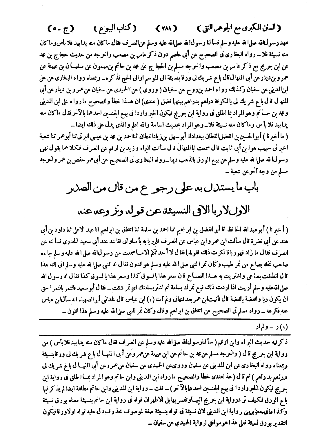 ذكر فيه حديث البراء وابن ارقم (سألنا رسول الله صلى الله عليه وسلم عن الصرف فقال ما كان منه يدا بيد فلا بأس) من رواية ابن جريج قال (واخرجه مسلم عن محمد بن حاتم عن ابن عيينة عن عمرو عن أبى المنهال باع شريك لى ورقا بنسيئة وبمعناه رواه البخاري عن ابن المدينى عن سفيان وروى عن الحميدى عن سفيان عن عمرو عن أبى المنهال باع شريك لى دراهم بدراهم) ثم قال (هذا عندي خطأ والصحيح ما رواه ابن المدينى وابن حاتم وهو المراد بما اطلق في رواية ابن جريج فيكون الخبر واردا في بيع الجنسين احدهما بالاخر) - قلت - رواية ابن المدينى وابن حاتم مطلقة ايضا لم يذكر فيها باع الورق فكيف ترد رواية ابن جريج إليها وتفسر بها بل الاظهر ان قوله في رواية ابن حاتم بنسيئة معناه بورق نسيئة وكذا ما في معناه من رواية ابن المدينى لان نسيئة في قوله بنسيئة صفة لموصوف محذوف دل عليه قوله اولا ورقا فيكون التقدير بورق نسيئة فعلى هذا هو موافق لرواية الحميدى عن سفيان -