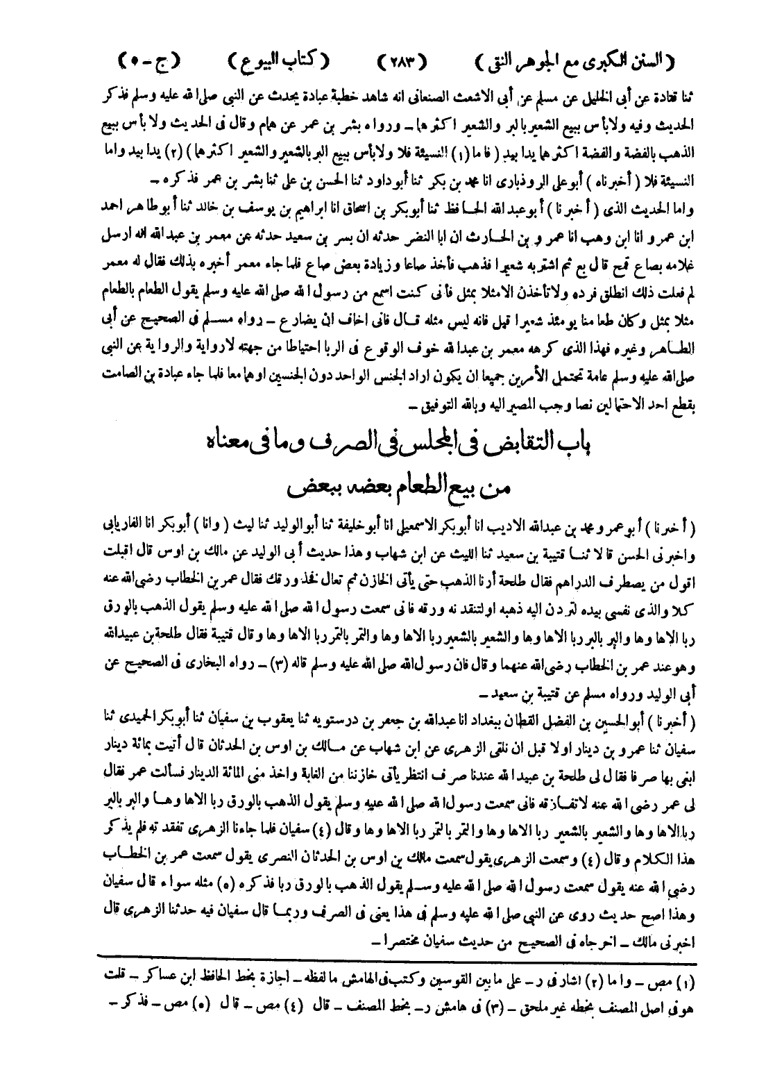 ثنا قتادة عن أبى الخليل عن مسلم عن أبى الاشعث الصنعانى انه شاهد خطبة عبادة يحدث عن النبي صلى الله عليه وسلم فذكر الحديث وفيه ولا بأس ببيع الشعير بالبر والشعير اكثرهما - ورواه بشر بن عمر عن همام وقال في الحديث ولا بأس ببيع الذهب بالفضة والفضة اكثرهما يدا بيد (فاما (1) النسيئة فلا ولا بأس ببيع البر بالشعير والشعير اكثرهما) (2) يدا بيد واما النسيئة فلا (أخبرناه) أبو على الروذبارى انا محمد بن بكر ثنا أبو داود ثنا الحسن بن على ثنا بشر بن عمر فذكره - واما الحديث الذى