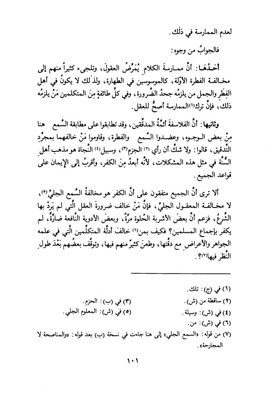أحدها: أن ممارسة الكلام يُمَرِّضُ العقول، وتلجىء كثيراً منهم إلى مخالفة الفطرة الأوّلة، كالموسوسين في الطهارة، ولذلك لا يكون في أهل الفِطَرِ والجمل من يلزمُه جحدُ الضرورة، وفي كل طائفةٍ من المتكلمين من يلزمه ذلك، فإن ترك (¬1) الممارسة أصحُّ للعقل.