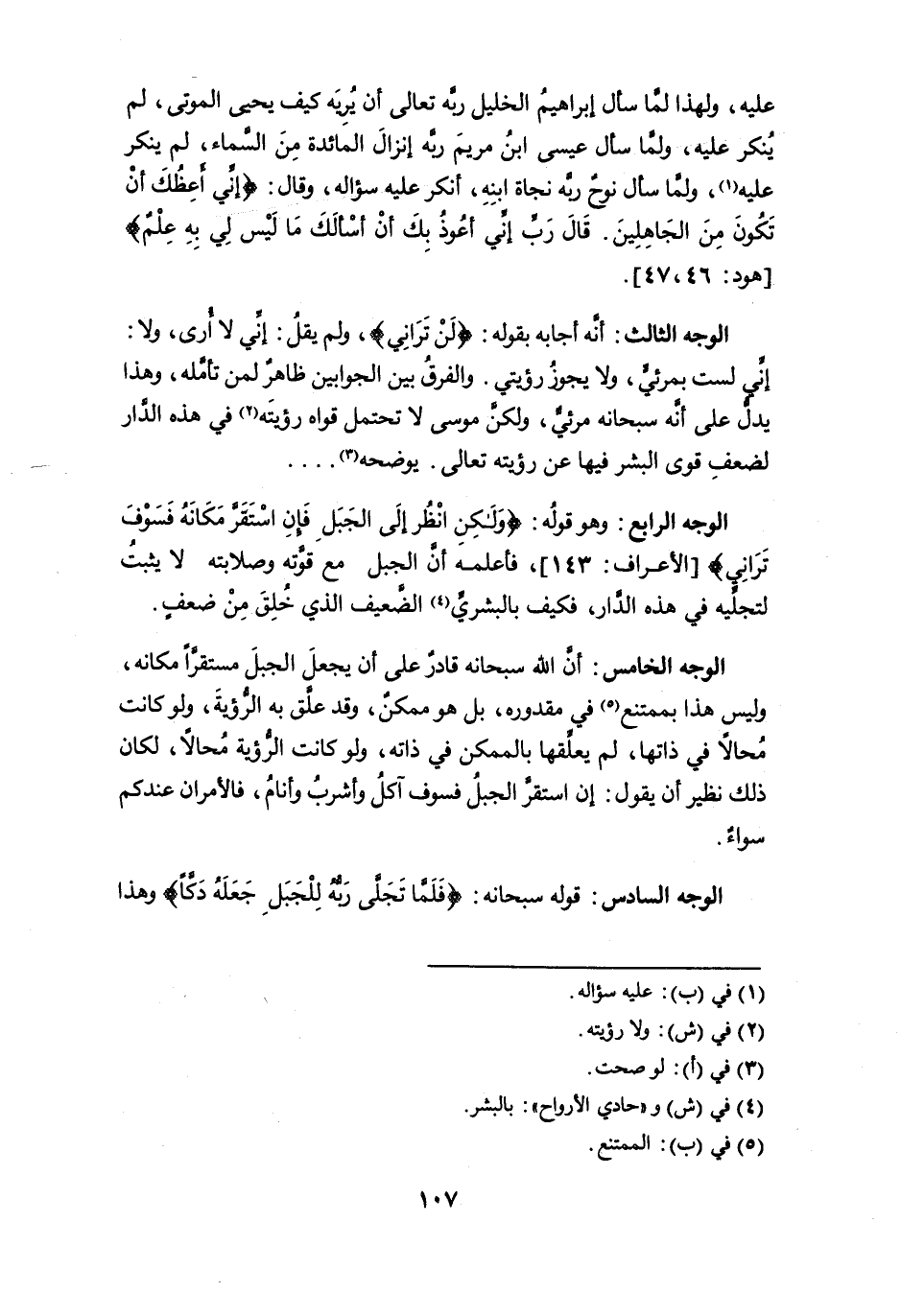 الوجه الخامس: أن الله سبحانه قادرٌ على أن يجعل الجبل مستقرَّاً مكانه، وليس هذا بممتنع (¬5) في مقدوره، بل هو ممكن، وقد علَّق به الرؤية، ولو كانت مُحالاً في ذاتها، لم يعلِّقها بالممكن في ذاته، ولو كانت الرؤية مُحالاً، لكان ذلك نظير أن يقول: أن استقرَّ الجبل فسوف آكل وأشرب وأنام، فالأمران عندكم سواءٌ.