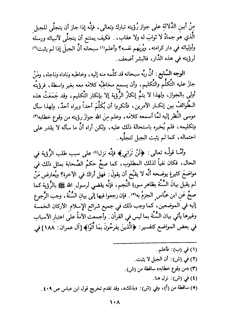 وأما قوله تعالى: {لن تراني} فإنه نزل (¬4) على سبب طلب الرؤية في الحال، فكان نفياً لذلك المطلوب، كما صح حكمُ الصحابة بمثل ذلك في مواضع كثيرةٍ يوضحه أنه لا يقبُح أن يقول: فهل أراك في الآخرة؟ ويعارض من لم يقبل بيان السنة بظاهر سورة النجم، فإنه يقضي لرسول الله - صلى الله عليه وسلم - بالرؤية كما صح عن ابن عباس الجزمُ به (¬5). فإن رجعوا فيها إلى بيان السنة، وجب الرُّجوع إليه في الموضعين، كما وجب ذلك في جميع شرائع الإسلام الأركان الخمسة وغيرها يأتي بيان السنة بما ليس في القرآن. وأجمعت الأمة على اعتبار الأسباب في بعض المواضع كتفسير: {الذين يفرحُون بمَا أَتَوْا} [آل عمران: 188] في