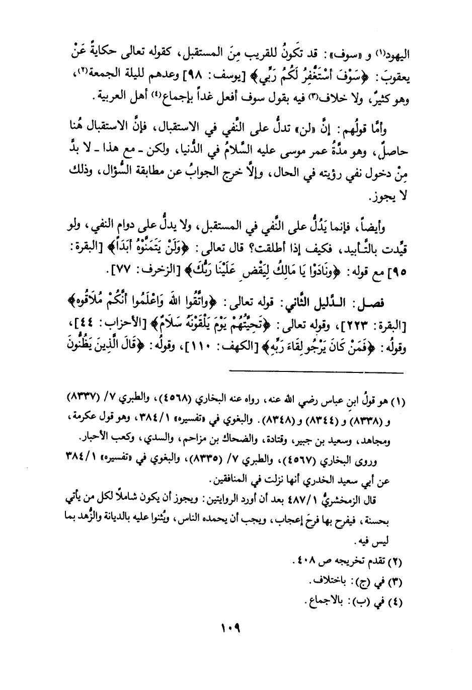 وأيضا، فإنما يدلُّ على النفي في المستقبل، ولا يدلُّ على دوام النفي، ولو قيِّدت بالتَّأبيد، فكيف إذا أطلقت؟ قال تعالى: {ولَنْ يَتَمَنَّوْهُ أبَدَاً} [البقرة: 95] مع قوله: {ونادَوْا يا مَالِكُ لِيَقْضِ علينا ربُّكَ} [الزخرف: 77].