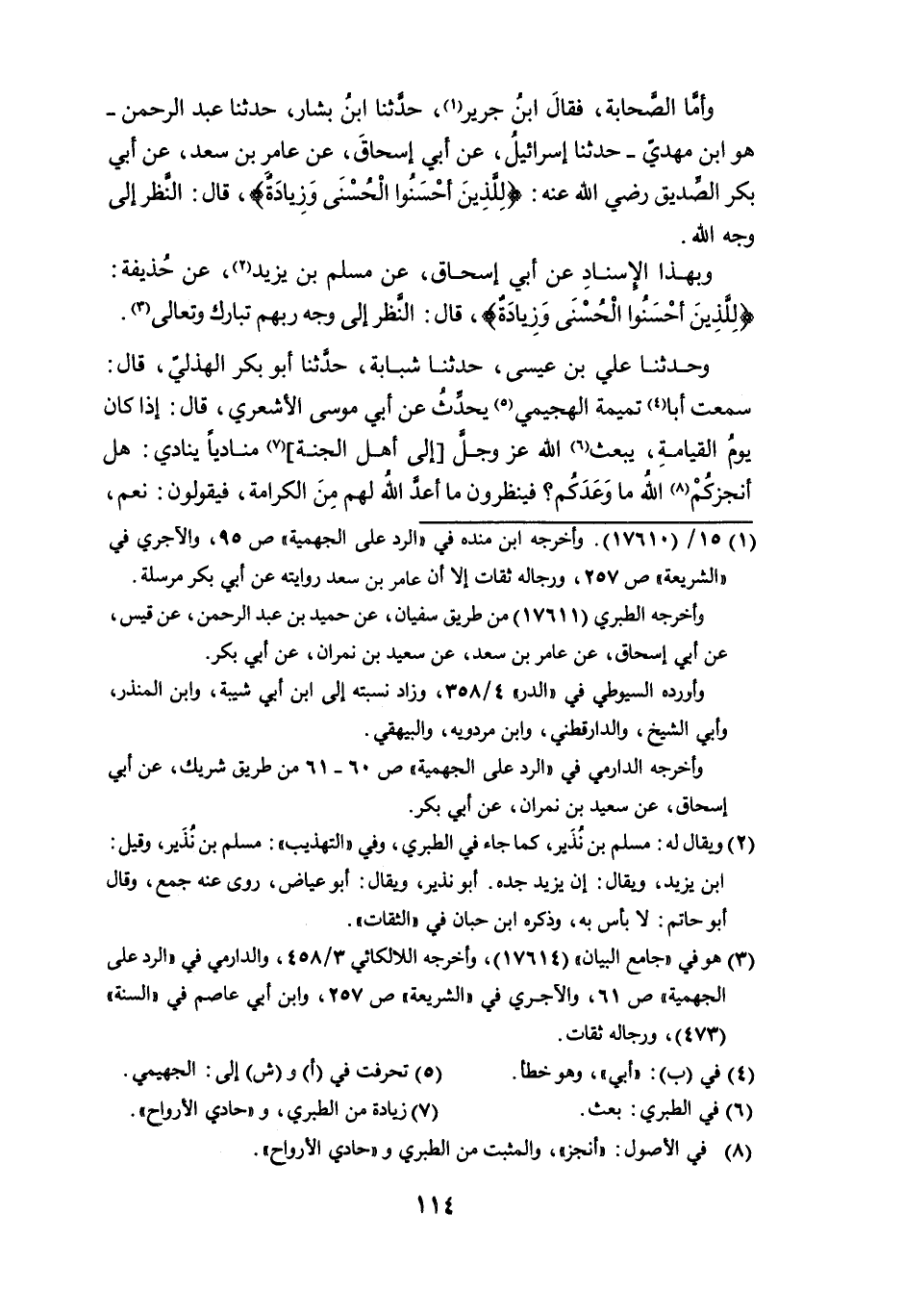 وأما الصحابة، فقال ابن جرير (¬1)، حدثنا ابن بشار، حدثنا عبد الرحمن -هو ابن مهدي- حدثنا إسرائيل، عن أبي إسحاق، عن عامر بن سعد، عن أبي بكر الصديق رضي الله عنه: {لِلَّذِينَ أَحْسَنُوا الْحُسْنَى وَزِيَادَةٌ}، قال: النظر إلى وجه الله.