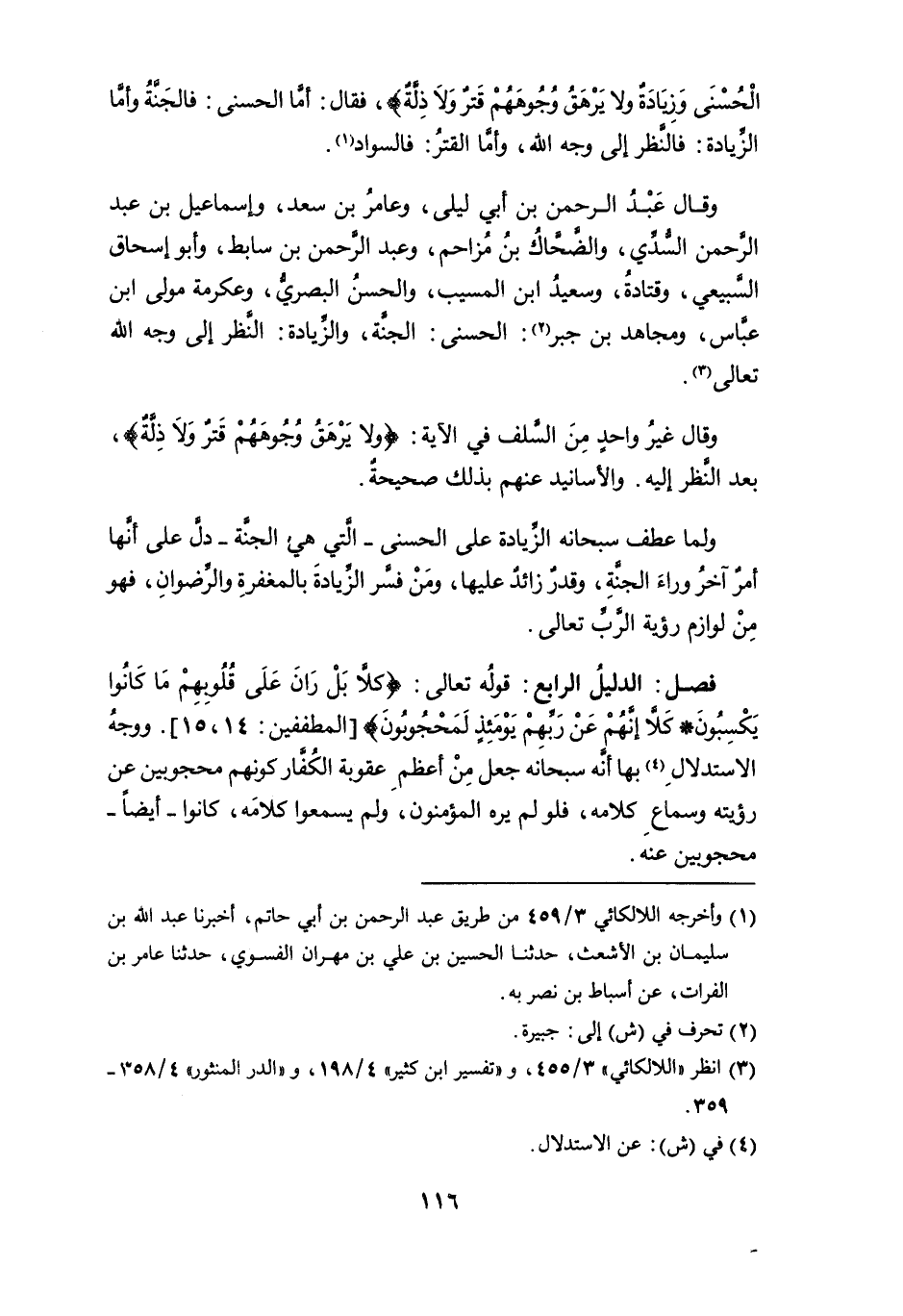 فصل: الدليل الرابع: قوله تعالى: {كَلَّا بَلْ رَانَ عَلَى قُلُوبِهِمْ مَا كَانُوا يَكْسِبُونَ (14) كَلَّا إِنَّهُمْ عَنْ رَبِّهِمْ يَوْمَئِذٍ لَمَحْجُوبُونَ (15)} [المطففين: 14، 15]. ووجه الاستدلال (¬4) بها أنه سبحانه جعل من أعظم عقوبة الكفار كونهم محجوبين عن رويته وسماع كلامه، فلو لم يره المؤمنون، ولم يسمعوا كلامه، كانوا -أيضاً- محجوبين عنه.